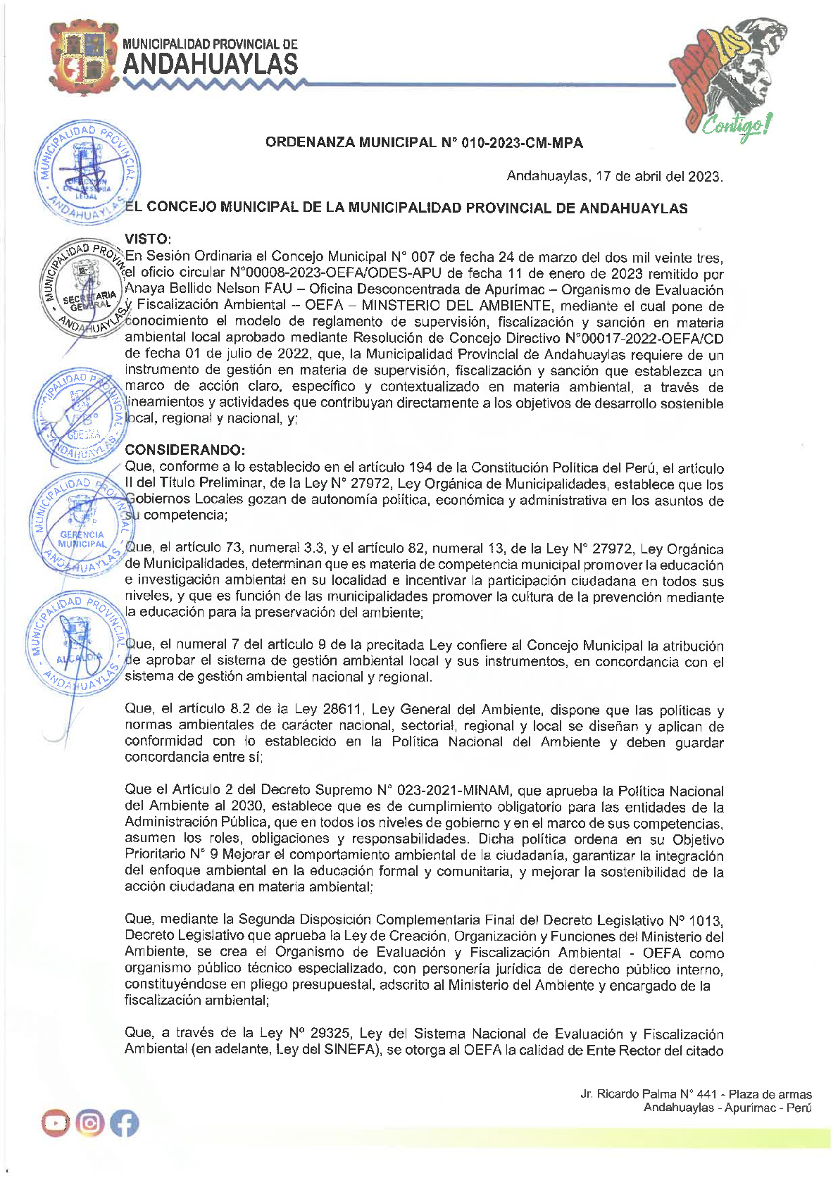 Ordenanza Municipal que Aprueba el Reglamento de Supervisión, Fiscalización y Sanción en Materia Ambiental Local de la Municipalidad Provincial de Andahuaylas