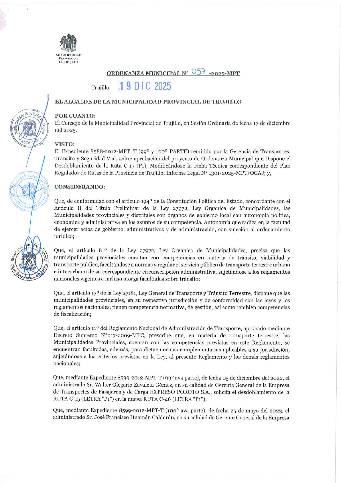 Ordenanza Municipal que dispone el desdoblamiento de la ruta C-15, modificándose la ficha técnica correspondiente del plan regulador de rutas de la provincia de Trujillo.