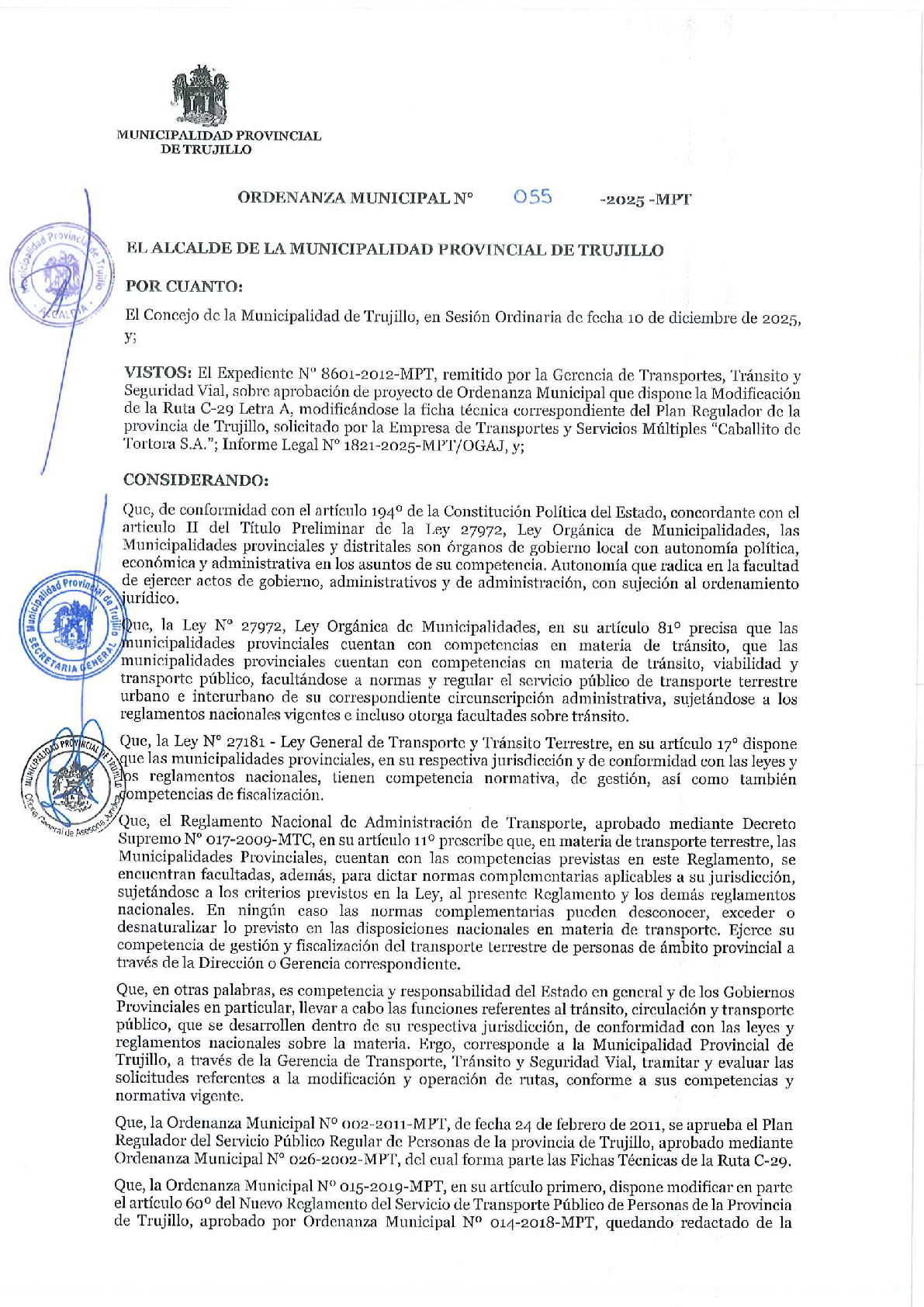 Ordenanza municipal que dispone la modificación de la ruta C-29, letra-A, modificación la ficha técnica correspondiente del plan regulador de rutas de la provincia de Trujillo.