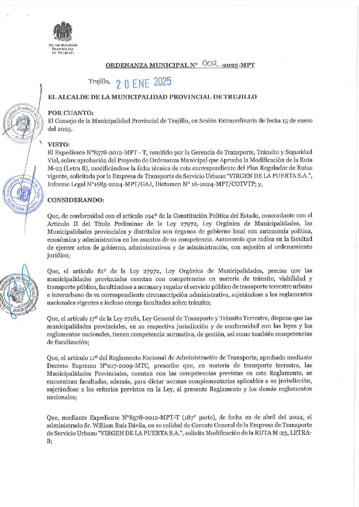 Ordenanza Municipal que Dispone la modificación de la Ruta M-23 Letra- B, Modificándose la Ficha Técnica correspondiente al Plan Regulador de Rutas de la provincia de Trujillo
