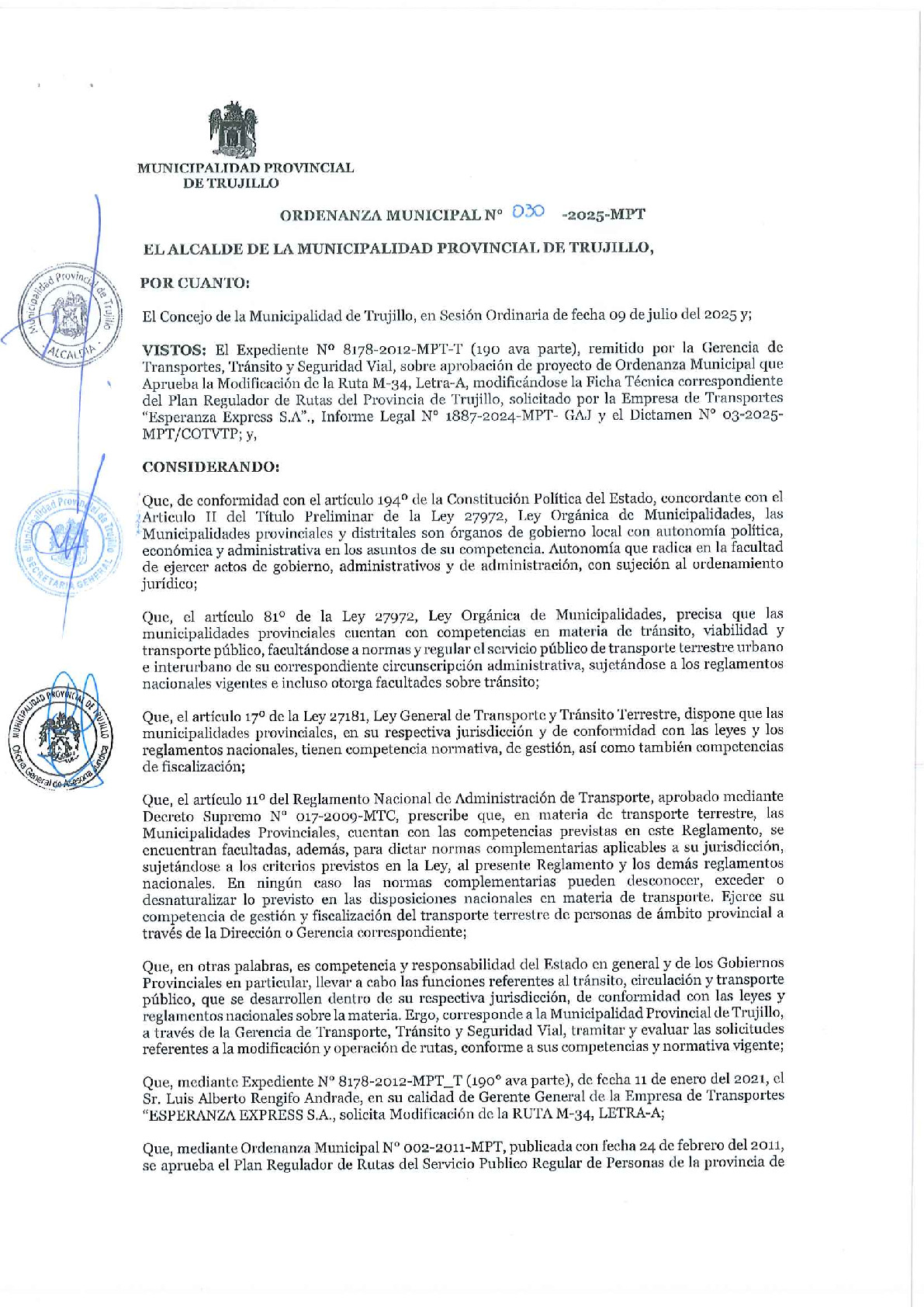 Ordenanza Municipal que dispone la Modificación de la Ruta M- 34, Letra - A, Modificándose la Ficha Técnica correspondiente del Plan Regulador de Rutas de la Provincia de Trujillo.