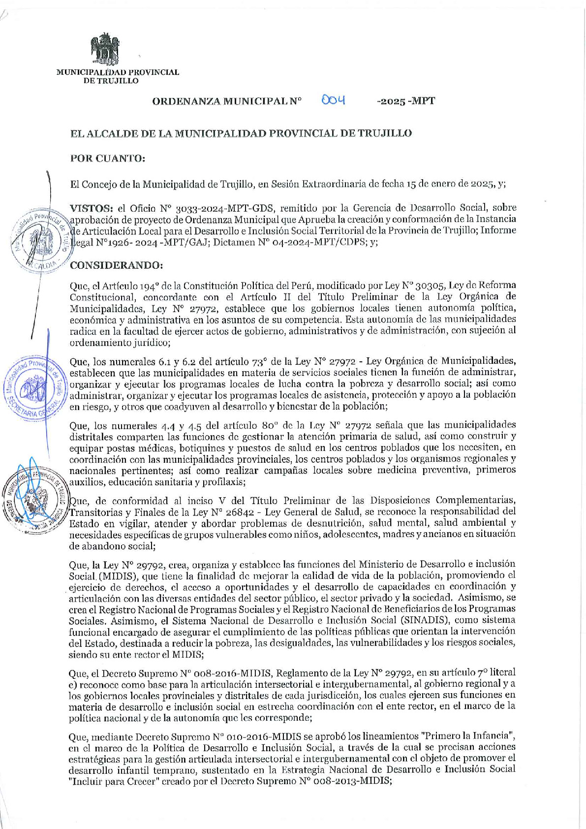 Ordenanza que aprueba la Creación y Conformación de la Instancia de Articulación Local para el Desarrollo e Inclusión Social Territorial de la Provincia de Trujillo ( IALDIST-DT)
