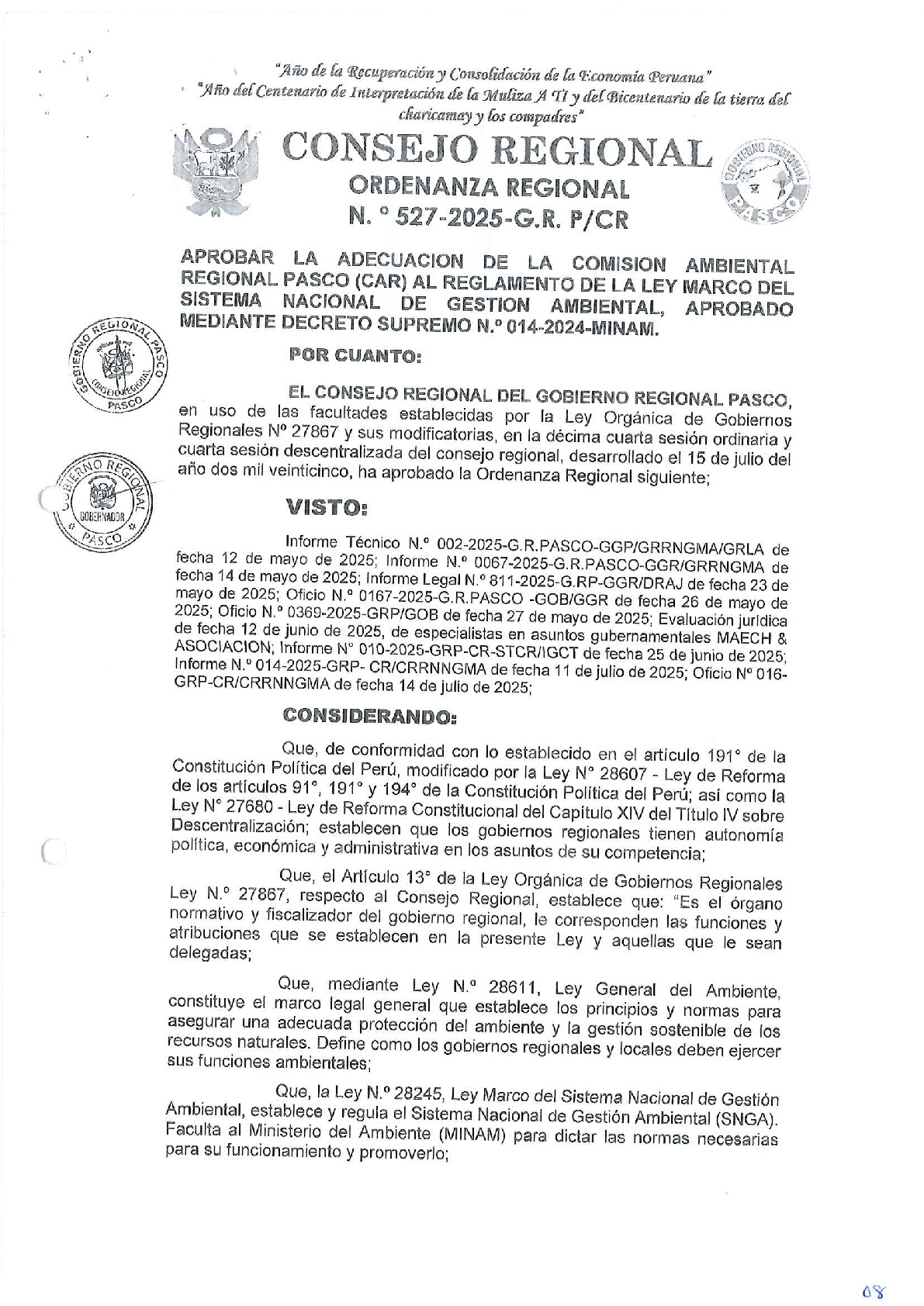 El Consejo Regional del Gobierno Regional Pasco, en uso de las facultades establecidas por la Ley Orgánica de Gobiernos Regionales N° 27867 y sus modificatorias, en la décima cuarta sesión ordinaria y cuarta sesión descentralizada del consejo regional, desarrollado el 15 de julio del año dos mil veinticinco, ha aprobado la Ordenanza Regional N° 527-2025-G.R.P/CR.