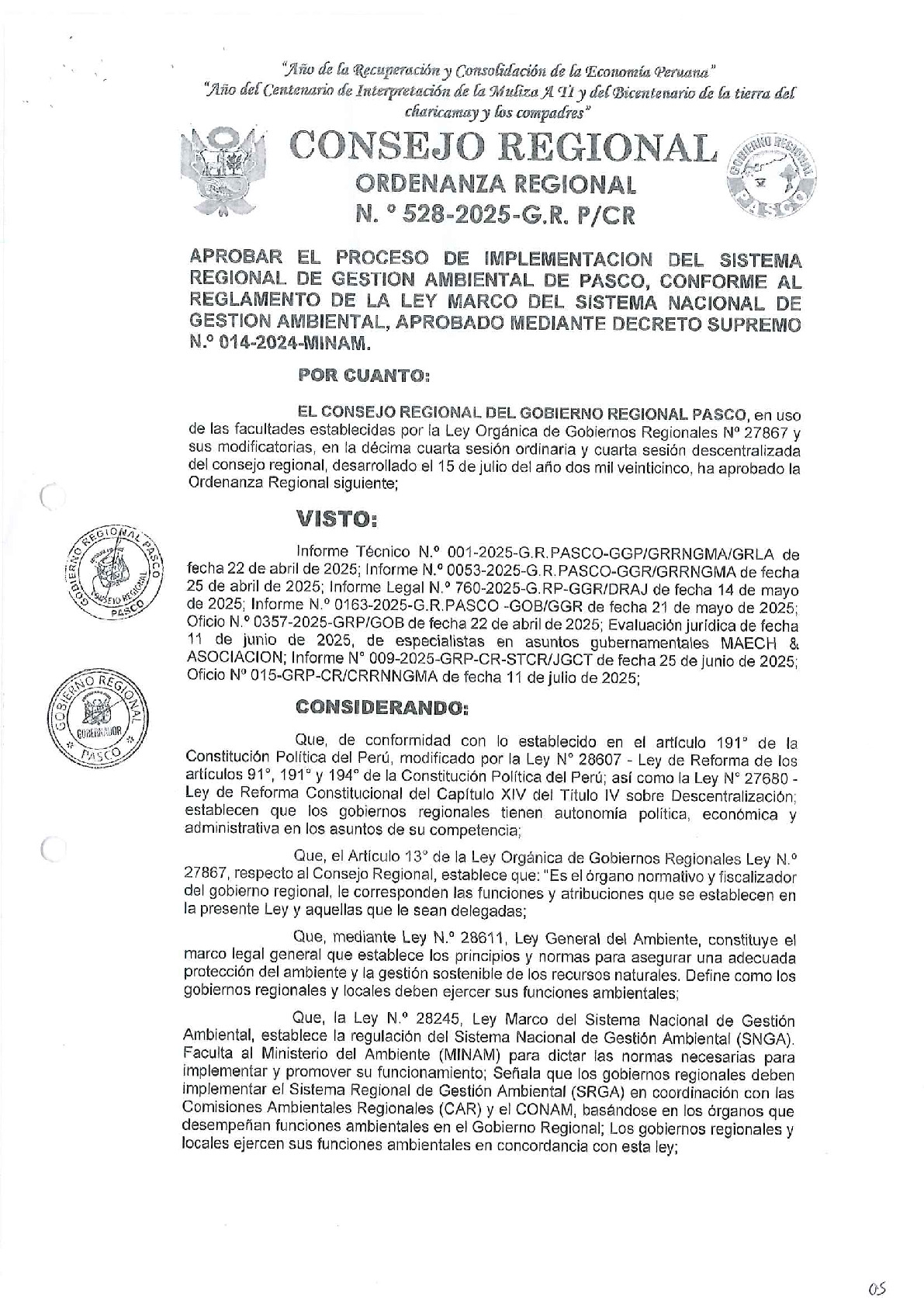 El Consejo Regional del Gobierno Regional Pasco, en uso de las facultades establecidas por la Ley Orgánica de Gobiernos Regionales N° 27867 y sus modificatorias, en la décima cuarta sesión ordinaria y cuarta sesión descentralizada del consejo regional, desarrollado el 15 de julio del año dos mil veinticinco, ha aprobado la Ordenanza Regional N° 528-2025-G.R.P/CR.