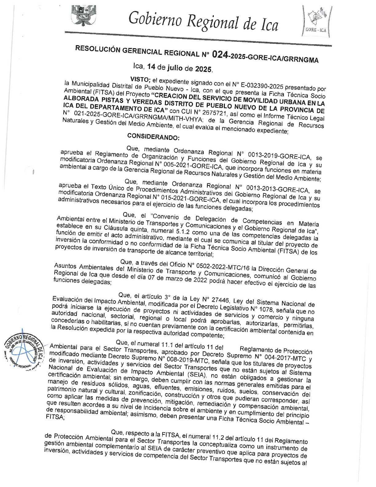 Conformidad a la ficha técnica socio ambiental FITSA del Proyecto "Creación del servicio de movilidad urbana en la alborada pistas y veredas Distrito de Pueblo Nuevo de la Provincia de Ica del Departamento de Ica" con CUI n°2675721