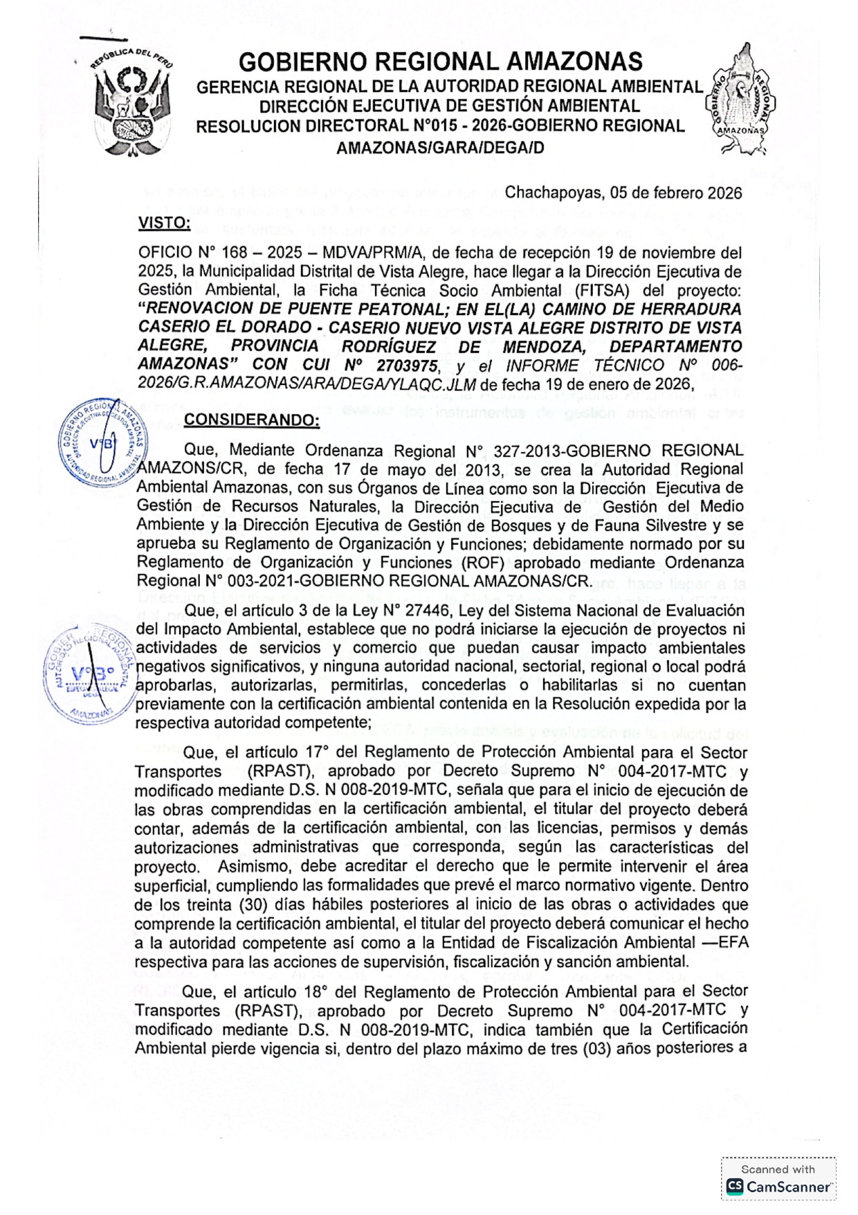 Esta Resolución Directoral tiene como antecedente al OFICIO Nº 168-2025-MDVA/A, de fecha de recepción 19 de noviembre del 2025presentado por la Municipalidad Distrital de Vista Alegre, el cual hizo llegar a la Dirección Ejecutiva de Gestión Ambiental (DEGA) del Gobierno Regional Amazonas la Ficha Técnica Socio Ambiental (FITSA) para el proyecto: "RENOVACIÓN DE PUENTE PEATONAL; EN EL(LA) CAMINO DE HERRADURA CASERÍO EL DORADO – CASERÍO NUEVO VISTA ALEGRE DISTRITO DE VISTA ALEGRE, PROVINCIA DE RODRÍGUEZ DE MENDOZA, DEPARTAMENTO DE AMAZONAS”. El proyecto cuenta con el Código Único de Inversiones (CUI) 2703975.