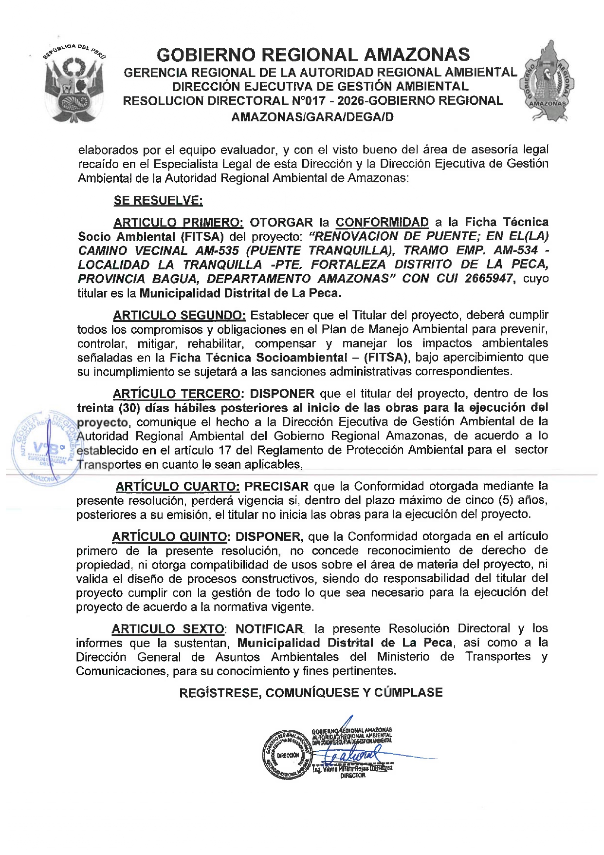 Esta Resolución Directoral tiene como antecedente al OFICIO Nº 012-2026/MDLP/DCC/A, de fecha de recepción 12 de enero del 2026 presentado por la Municipalidad Distrital de la Peca, el cual hizo llegar a la Dirección Ejecutiva de Gestión Ambiental (DEGA) del Gobierno Regional Amazonas la Ficha Técnica Socio Ambiental (FITSA) para el proyecto: "RENOVACIÓN DE PUENTE; EN EL(LA) CAMINO VECINAL AM-535 (PUENTE TRANQUILLA), TRAMO EMP. AM-534 – LOCALIDAD LA TRANQUILLA – PTE. FORTALEZA DISTRITO DE LA PECA, PROVINCIA DE BAGUA, DEPARTAMENTO DE AMAZONAS”. El proyecto cuenta con el Código Único de Inversiones (CUI) 2665947.