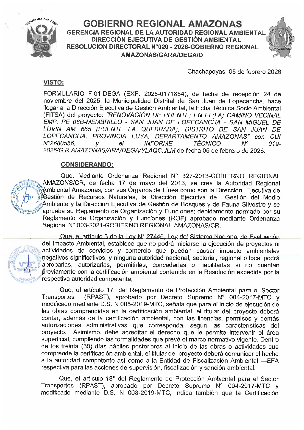 Esta Resolución Directoral tiene como antecedente al FORMULARIO F-01-DEGA, (EXP. 2025-0171854) de fecha de recepción 24 de noviembre del 2025, presentado por la Municipalidad Distrital de San Juan de Lopecancha, el cual hizo llegar a la Dirección Ejecutiva de Gestión Ambiental (DEGA) del Gobierno Regional Amazonas la Ficha Técnica Socio Ambiental (FITSA) para el proyecto: "RENOVACIÓN DE PUENTE; EN EL(LA) CAMINO VECINAL EMP. PE 08B-MEMBRILLO – SAN JUAN DE LOPECANCHA – SAN MIGUEL DE LUVIN AM 665 (PUENTE LA QUEBRADA), DISTRITO DE SAN JUAN DE LOPECANCHA, PROVINCIA DE LUYA, DEPARTAMENTO DE AMAZONAS”. El proyecto cuenta con el Código Único de Inversiones (CUI) 2680556.