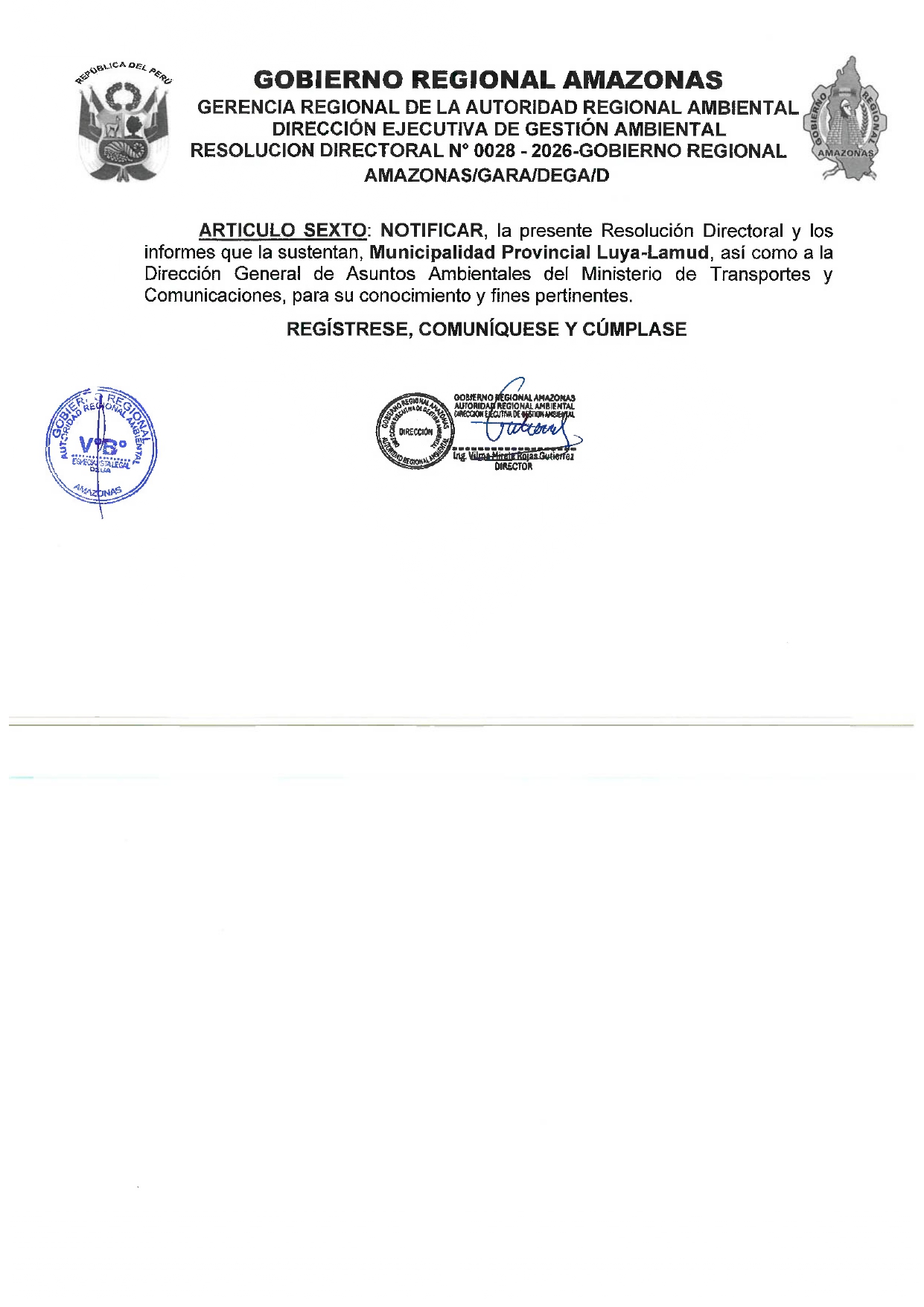 Esta Resolución Directoral tiene como antecedente al OFICIO Nº 205-2025-MDSR (EXP. 2025-0188904), de fecha de recepción 22 de diciembre del 2025, presentado por la Municipalidad Distrital de Santa Rosa, el cual hizo llegar a la Dirección Ejecutiva de Gestión Ambiental (DEGA) del Gobierno Regional Amazonas la Ficha Técnica Socio Ambiental (FITSA) para el proyecto: "RENOVACIÓN DE PUENTE; EN EL (LA) CAMINO VECINAL LAMUD – RETAMA – CORREDOR – QUILAYLON R010615 (PUENTE CIRCUNVALACIÓN), DISTRITO DE LAMUD, PROVINCIA DE LUYA, DEPARTAMENTO DE AMAZONAS”. El proyecto cuenta con el Código Único de Inversiones (CUI) 2677455.