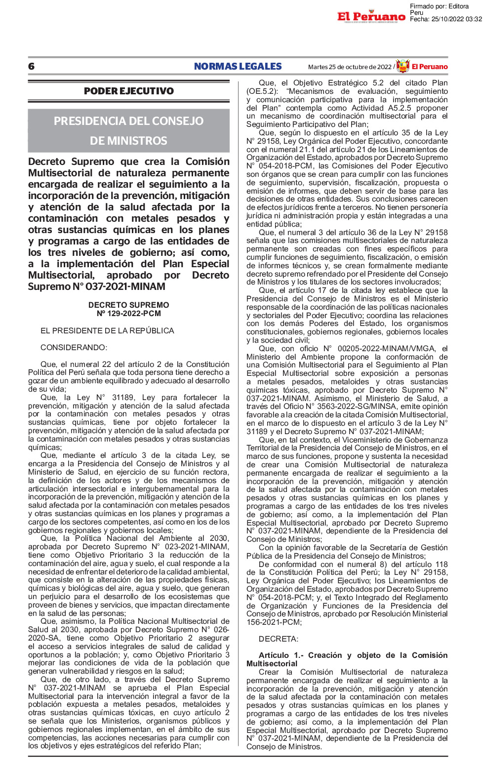 El Decreto Supremo N° 129-2022-PCM establece la creación de una Comisión Multisectorial de naturaleza permanente bajo la Presidencia del Consejo de Ministros (PCM). Su objetivo principal es realizar el seguimiento a la implementación del Plan Especial Multisectorial y asegurar que las entidades de los tres niveles de gobierno incorporen acciones de prevención, mitigación y atención de la salud para las poblaciones afectadas por la contaminación con metales pesados y otras sustancias químicas. Esta comisión, presidida por la PCM, está integrada por diversos ministerios, organismos técnicos (como OEFA y ANA) y representantes de la sociedad civil, quienes ejercen sus funciones ad honorem para elaborar informes técnicos y proponer mecanismos de financiamiento que garanticen la atención integral de los afectados.
