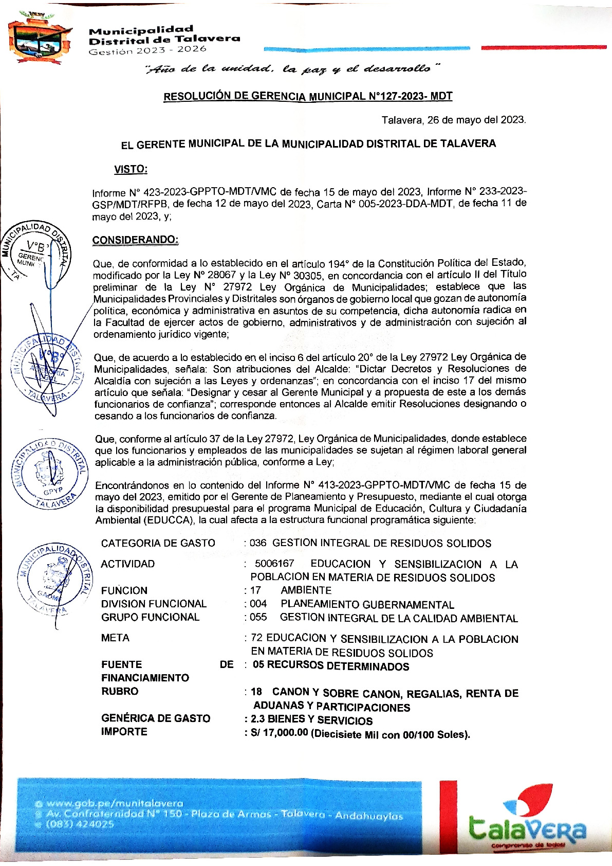 La presente Resolución de Gerencia Municipal aprueba el Plan de Trabajo 2024 del Programa Municipal de Educación, Cultura y Ciudadanía Ambiental de la Municipalidad Distrital de Talavera - Andahuaylas (Apurímac), con la finalidad de definir las actividades de educación, cultura y ciudadanía ambiental que se desarrollaran en la localidad durante el presente año.