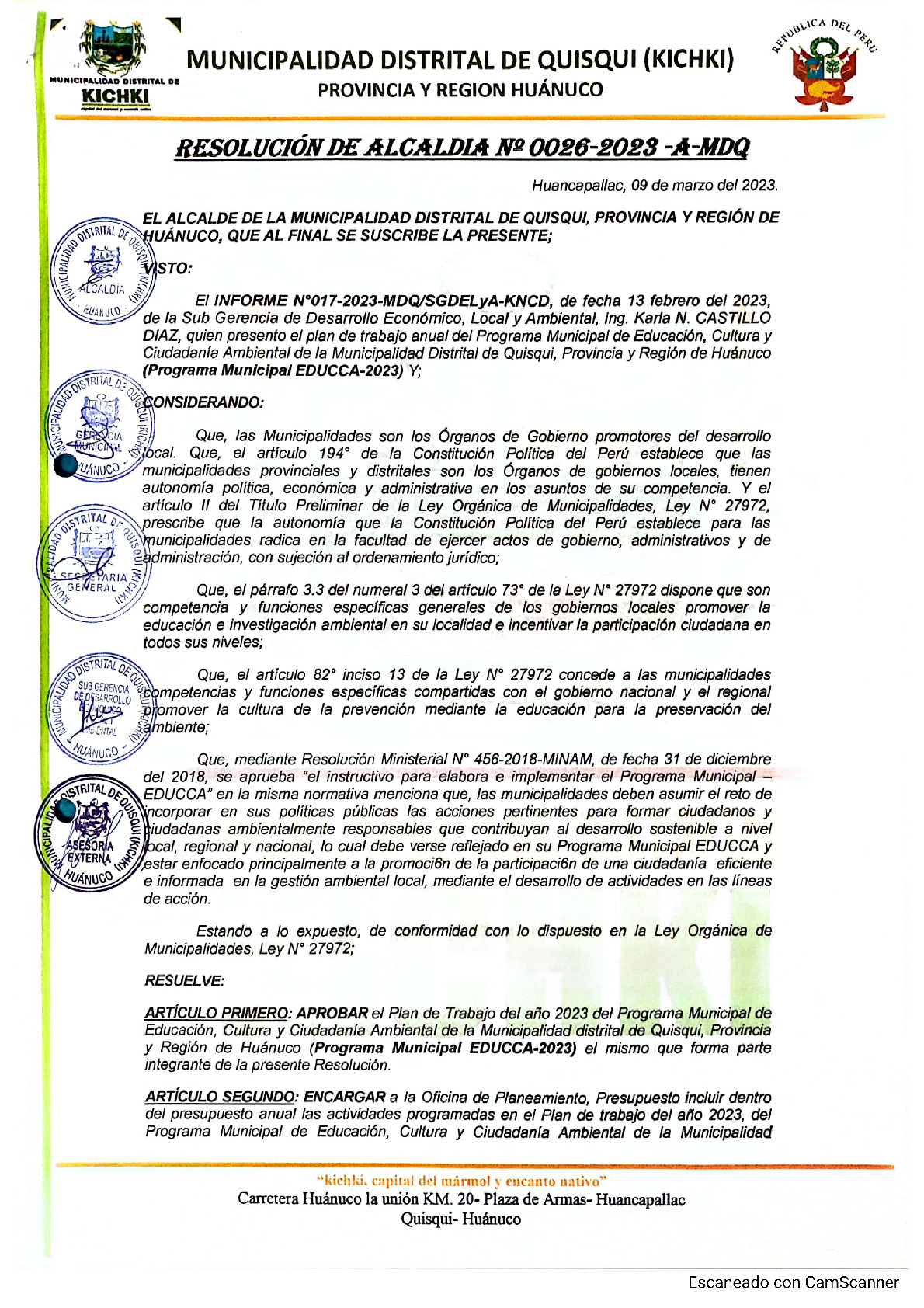 La presente Resolución de Alcaldía aprueba el Plan de Trabajo 2023 del Programa Municipal de Educación, Cultura y Ciudadanía Ambiental de la Municipalidad Distrital de Quisqui - Huánuco (Huánuco), con la finalidad de definir las actividades de educación, cultura y ciudadanía ambiental que se desarrollaran en la localidad durante el presente año.