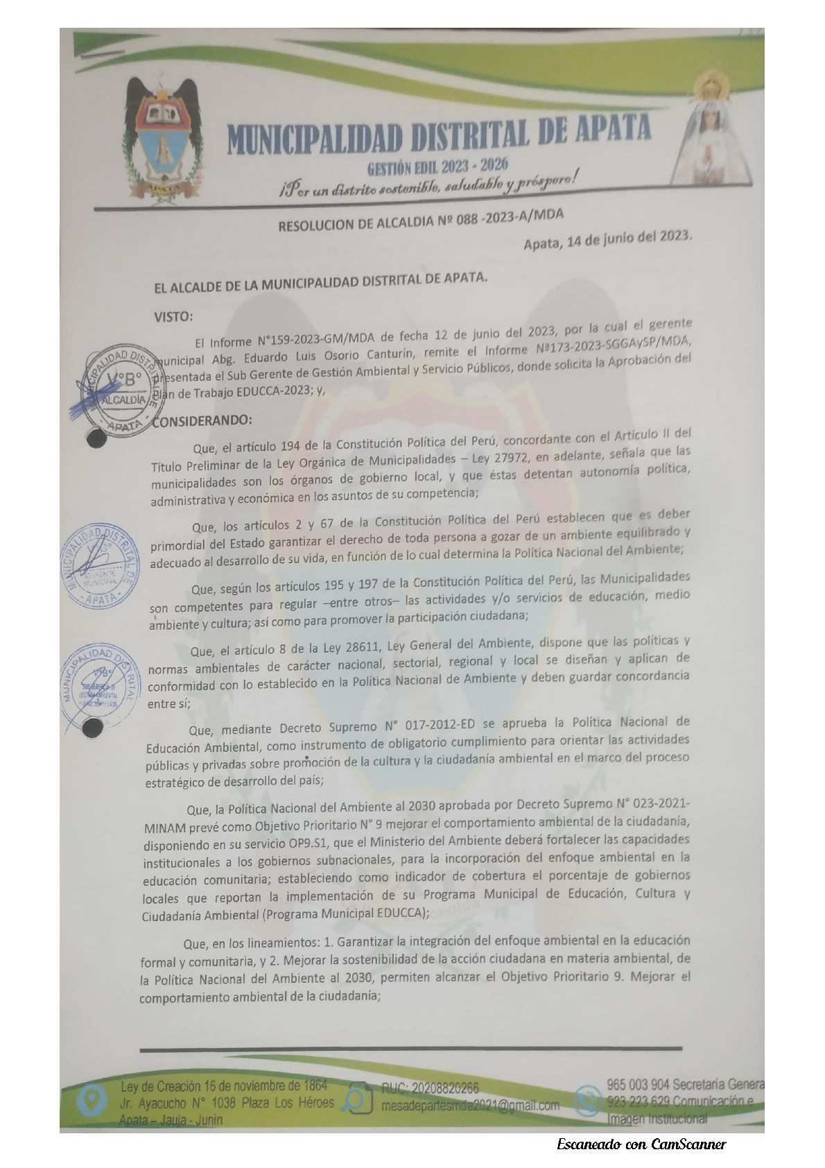 La presente Resolución de Alcaldía aprueba el Plan de Trabajo 2023 del Programa Municipal de Educación, Cultura y Ciudadanía Ambiental de la Municipalidad Distrital de Apata - Jauja (Junín), con la finalidad de definir las actividades de educación, cultura y ciudadanía ambiental que se desarrollaran en la localidad durante el presente año.