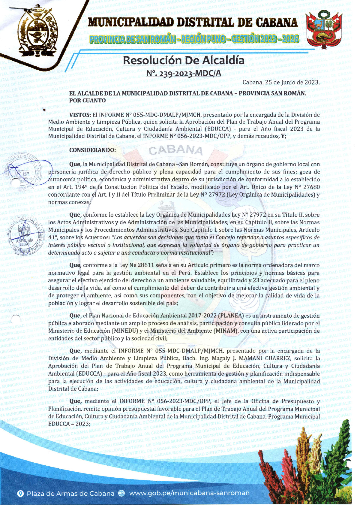 La presente Resolución de Alcaldía aprueba el Plan de Trabajo 2023 del Programa Municipal de Educación, Cultura y Ciudadanía Ambiental de la Municipalidad Distrital de Cabana - San Román (Puno), con la finalidad de definir las actividades de educación, cultura y ciudadanía ambiental que se desarrollaran en la localidad durante el presente año.