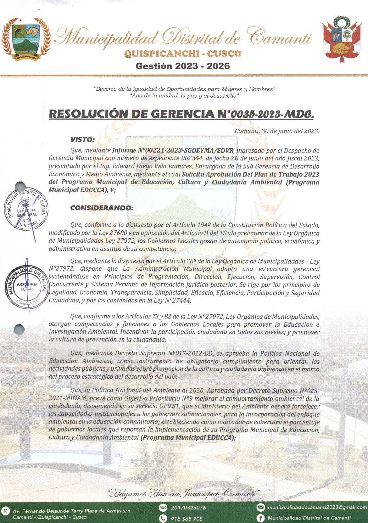 La presente Resolución de Gerencia Municipal aprueba el Plan de Trabajo 2023 del Programa Municipal de Educación, Cultura y Ciudadanía Ambiental de la Municipalidad Distrital de Camanti (Cusco), con la finalidad de definir las actividades de educación, cultura y ciudadanía ambiental que se desarrollaran en la localidad durante el presente año.