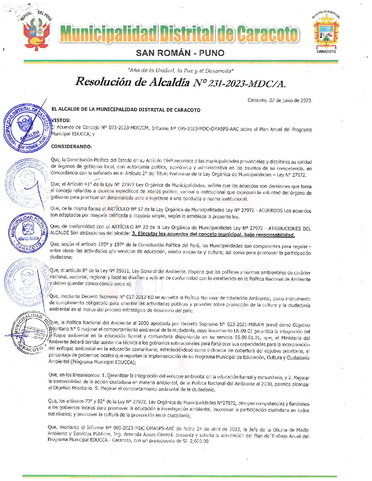 La presente Resolución de Alcaldía aprueba el Plan de Trabajo 2023 del Programa Municipal de Educación, Cultura y Ciudadanía Ambiental de la Municipalidad Distrital de Caracoto - San Román (Puno), con la finalidad de definir las actividades de educación, cultura y ciudadanía ambiental que se desarrollaran en la localidad durante el presente año.