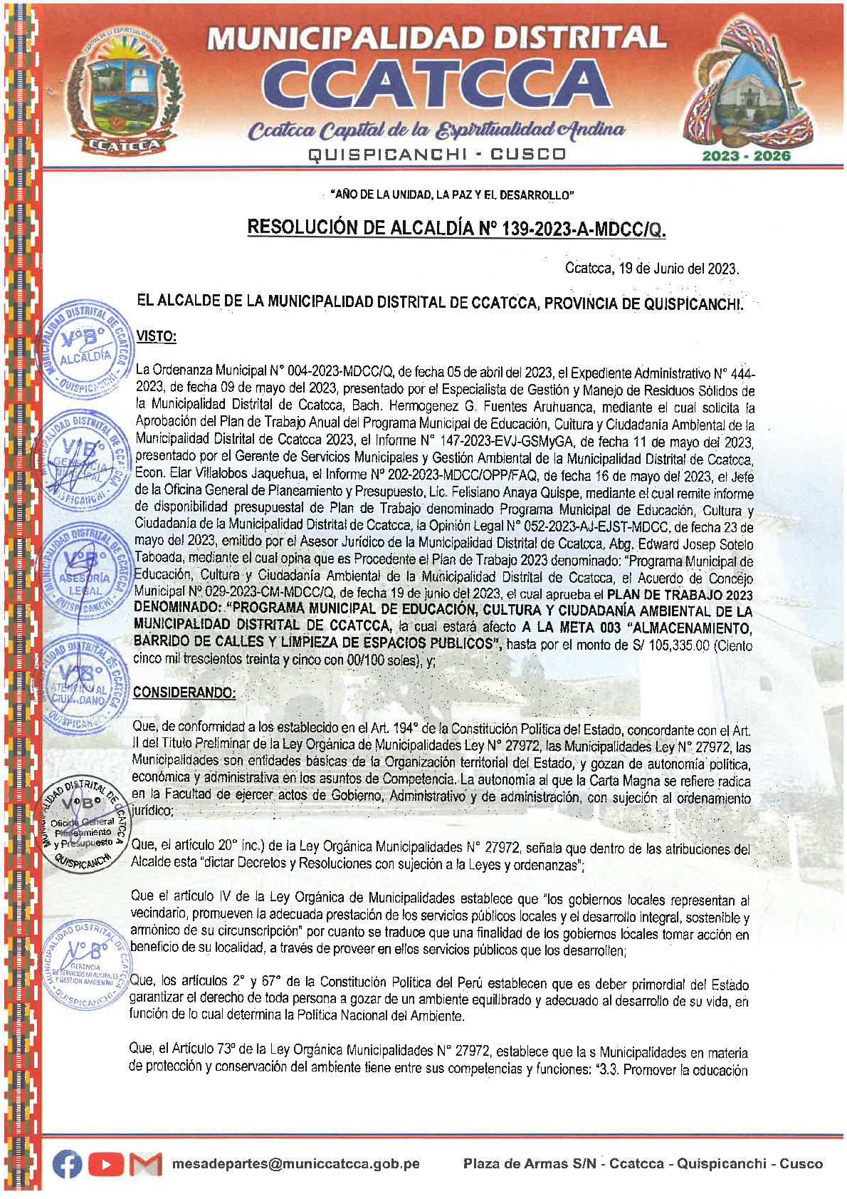La presente Resolución de Alcaldía aprueba el Plan de Trabajo 2023 del Programa Municipal de Educación, Cultura y Ciudadanía Ambiental de la Municipalidad Distrital de Ccatcca - Quispicanchi (Cusco), con la finalidad de definir las actividades de educación, cultura y ciudadanía ambiental que se desarrollaran en la localidad durante el presente año.