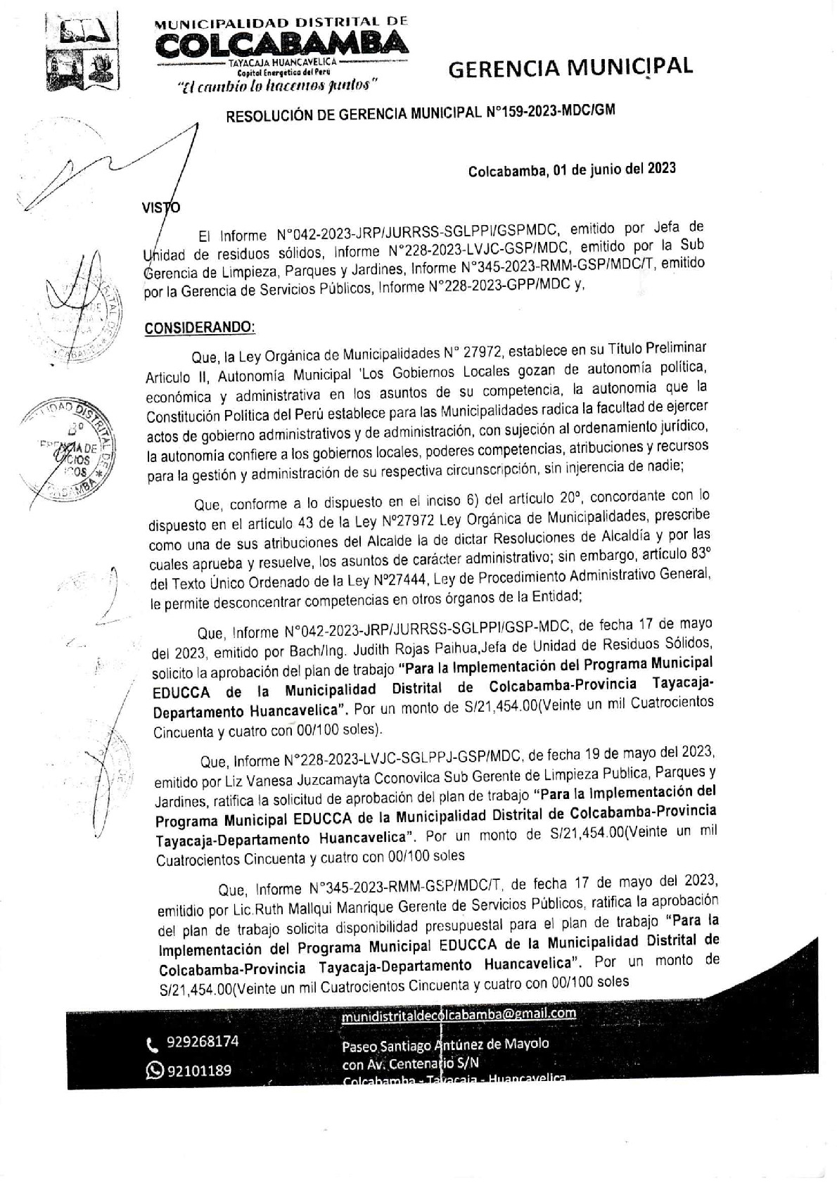 La presente Resolución de Gerencia Municipal aprueba el Plan de Trabajo 2023 del Programa Municipal de Educación, Cultura y Ciudadanía Ambiental de la Municipalidad Distrital de Colcabamba (Huancavelica), con la finalidad de definir las actividades de educación, cultura y ciudadanía ambiental que se desarrollaran en la localidad durante el presente año.