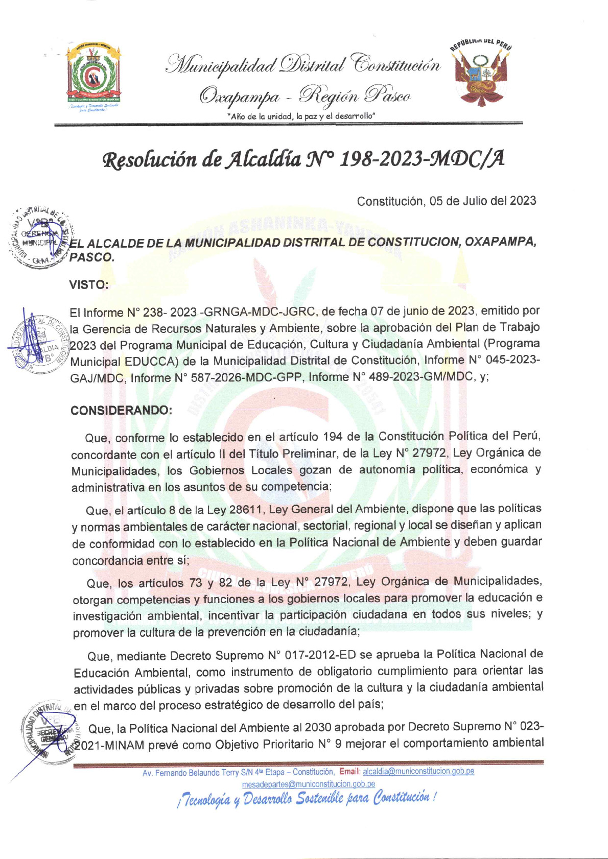 La presente Resolución de Alcaldía aprueba el Plan de Trabajo 2023 del Programa Municipal de Educación, Cultura y Ciudadanía Ambiental de la Municipalidad Distrital de Constitución - Oxapampa (Pasco), con la finalidad de definir las actividades de educación, cultura y ciudadanía ambiental que se desarrollaran en la localidad durante el presente año.