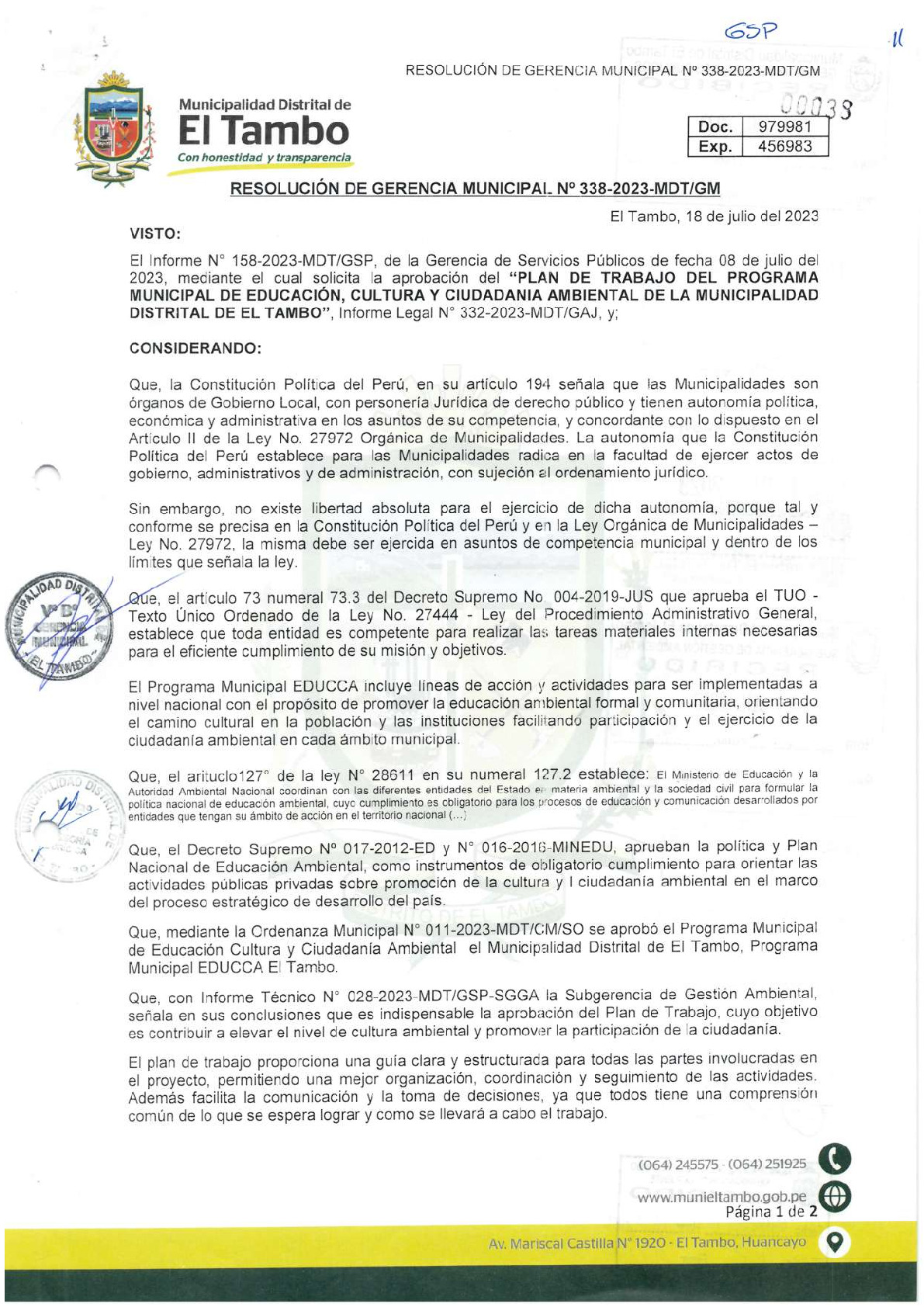 La presente Resolución de Gerencia Municipal aprueba el Plan de Trabajo 2023 del Programa Municipal de Educación, Cultura y Ciudadanía Ambiental de la Municipalidad Distrital de El Tambo (Junín), con la finalidad de definir las actividades de educación, cultura y ciudadanía ambiental que se desarrollaran en la localidad durante el presente año.