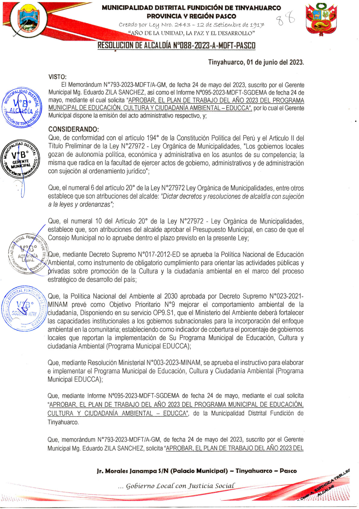 La presente Resolución de Alcaldía aprueba el Plan de Trabajo 2023 del Programa Municipal de Educación, Cultura y Ciudadanía Ambiental de la Municipalidad Distrital de Fundición de Tinyahuarco - Pasco (Pasco), con la finalidad de definir las actividades de educación, cultura y ciudadanía ambiental que se desarrollaran en la localidad durante el presente año.