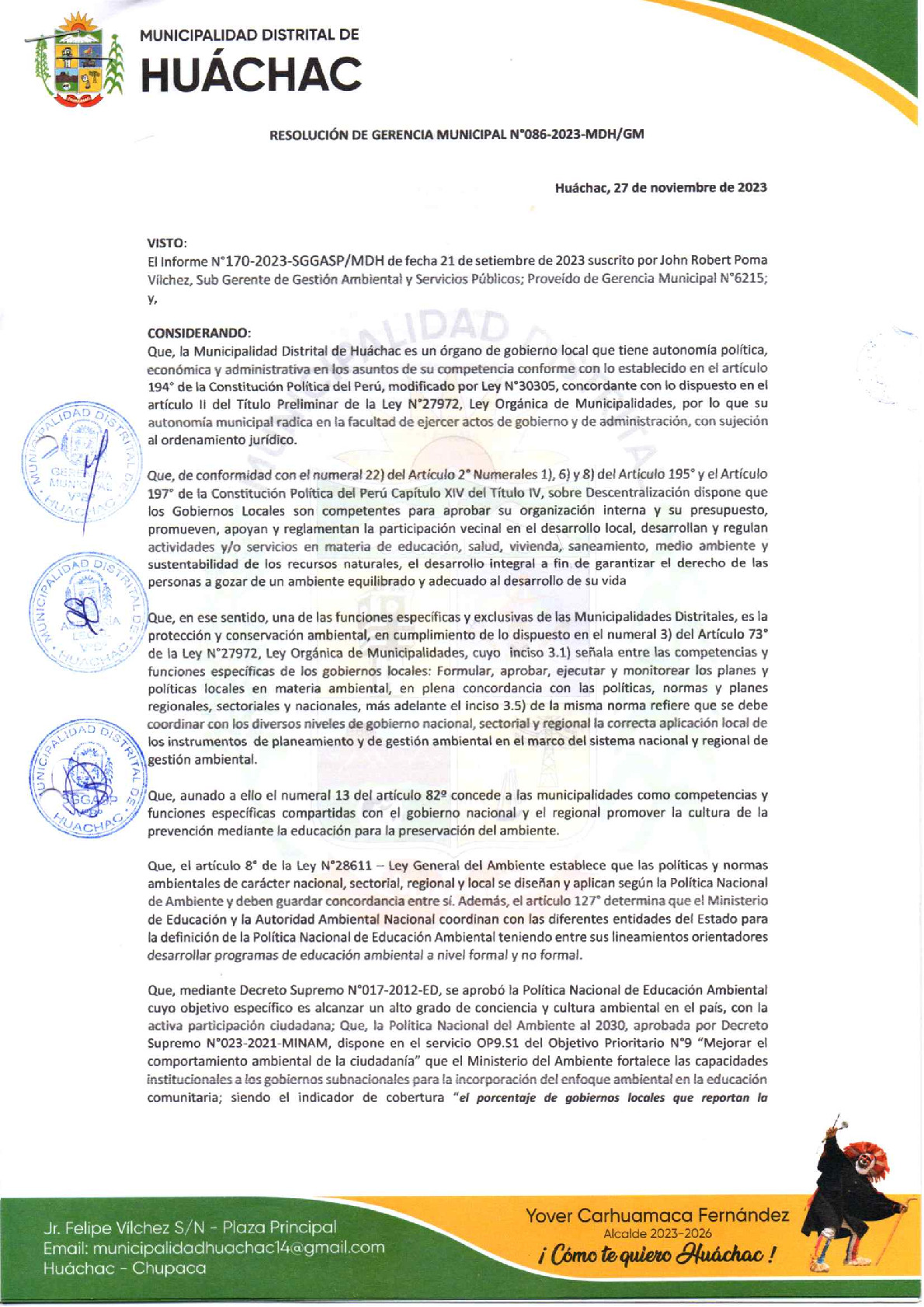 La presente Resolución de Gerencia Municipal aprueba el Plan de Trabajo 2023 del Programa Municipal de Educación, Cultura y Ciudadanía Ambiental de la Municipalidad Distrital de Huáchac - Chupaca (Junín), con la finalidad de definir las actividades de educación, cultura y ciudadanía ambiental que se desarrollaran en la localidad durante el presente año.