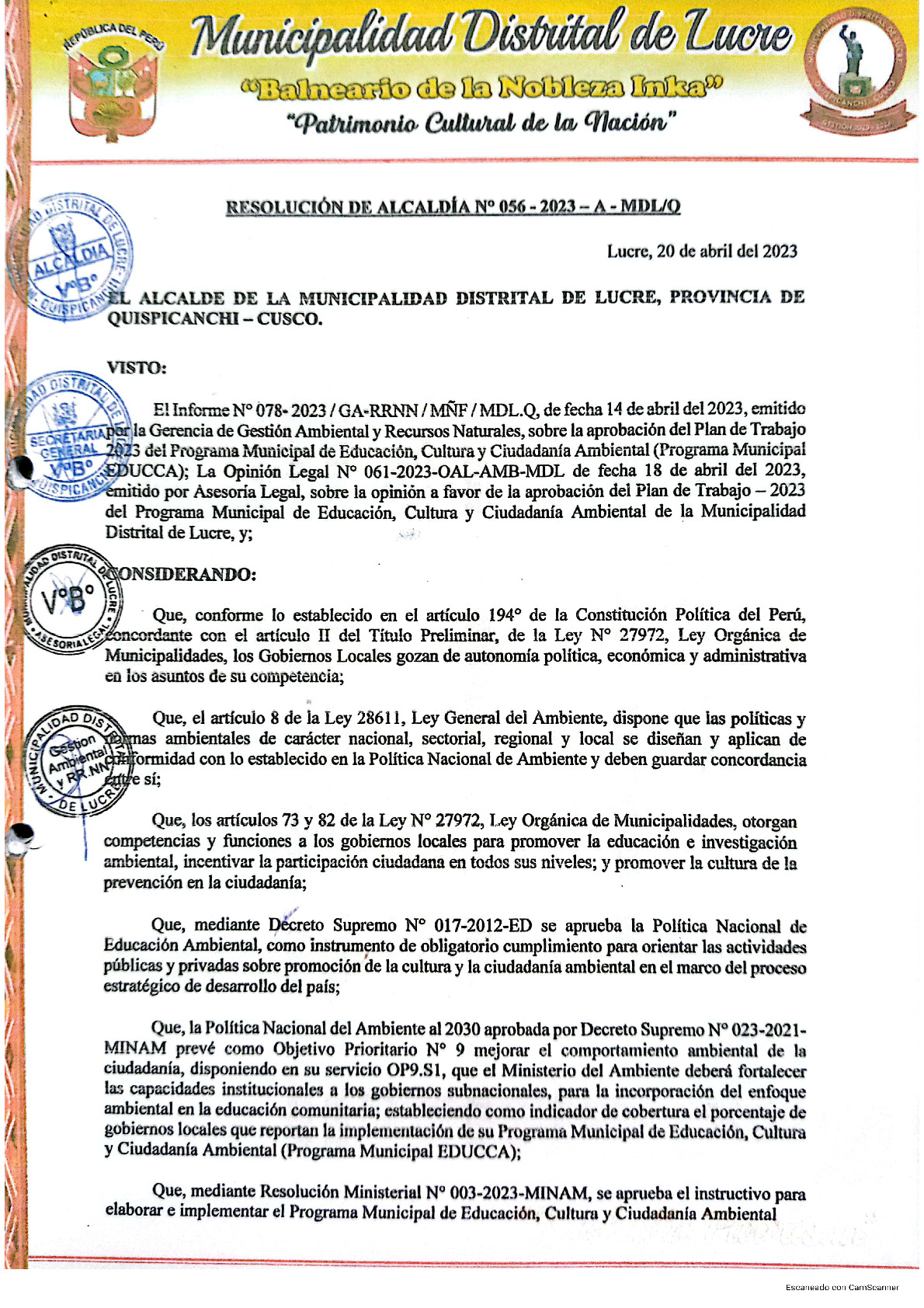 La presente Resolución de Alcaldía aprueba el Plan de Trabajo 2023 del Programa Municipal de Educación, Cultura y Ciudadanía Ambiental de la Municipalidad Distrital de Lucre -Quispicanchi (Cusco), con la finalidad de definir las actividades de educación, cultura y ciudadanía ambiental que se desarrollaran en la localidad durante el presente año.