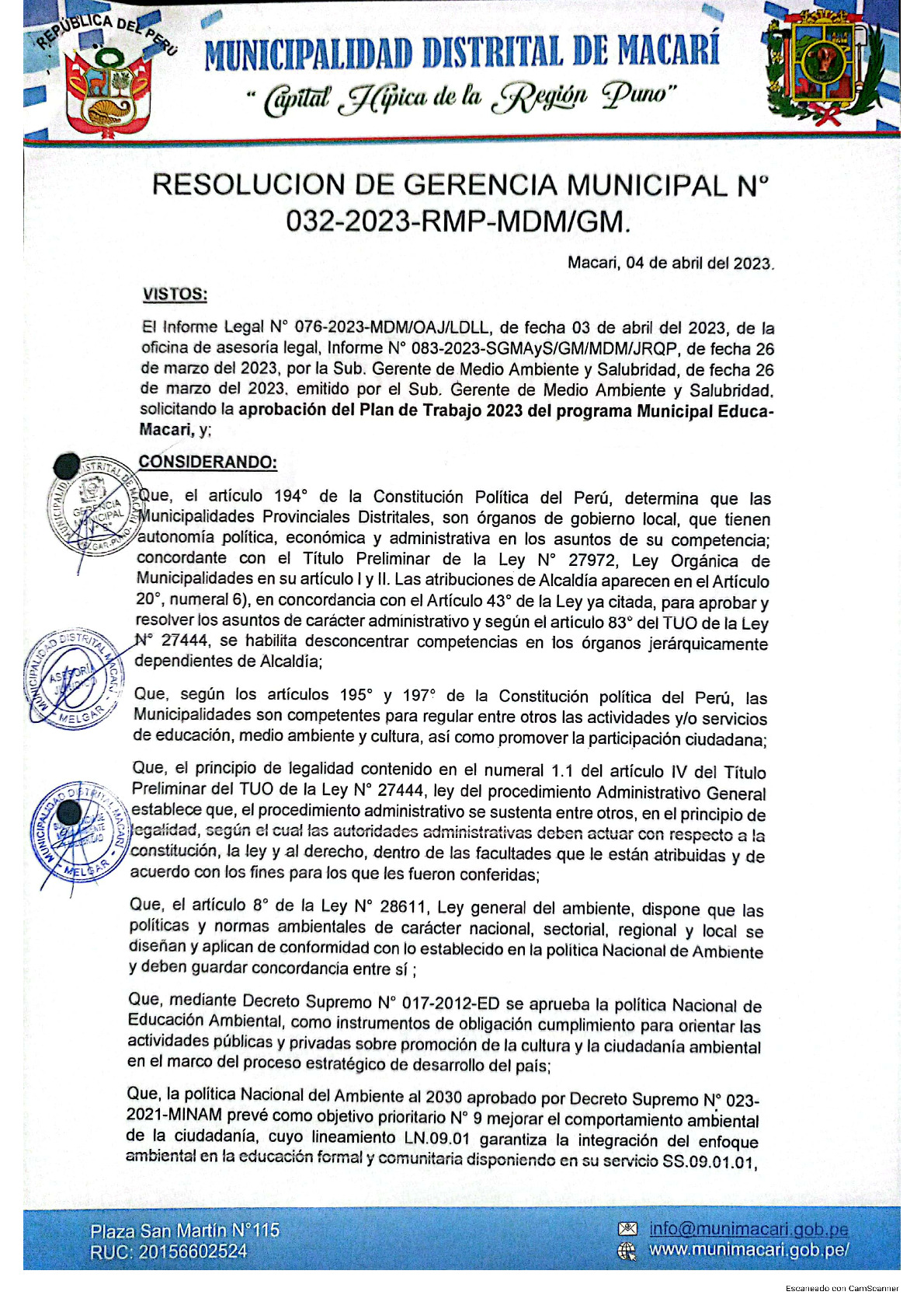 La presente Resolución de Gerencia Municipal aprueba el Plan de Trabajo 2023 del Programa Municipal de Educación, Cultura y Ciudadanía Ambiental de la Municipalidad Distrital de Macarí (Puno), con la finalidad de definir las actividades de educación, cultura y ciudadanía ambiental que se desarrollaran en la localidad durante el presente año.