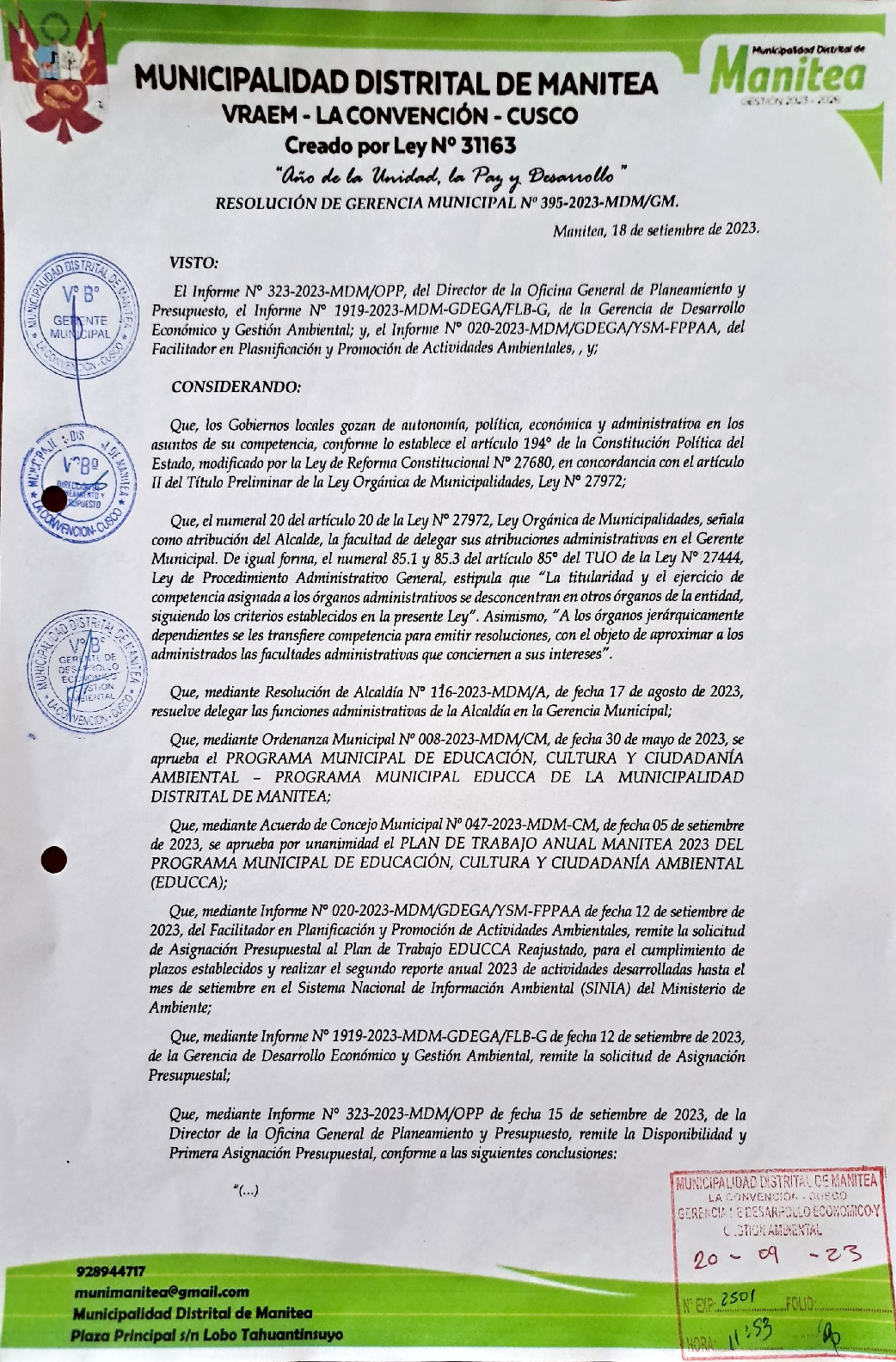La presente Resolución de Gerencia Municipal aprueba el Plan de Trabajo 2023 del Programa Municipal de Educación, Cultura y Ciudadanía Ambiental de la Municipalidad Distrital de Manitea - La Convención (Cusco), con la finalidad de definir las actividades de educación, cultura y ciudadanía ambiental que se desarrollaran en la localidad durante el presente año.