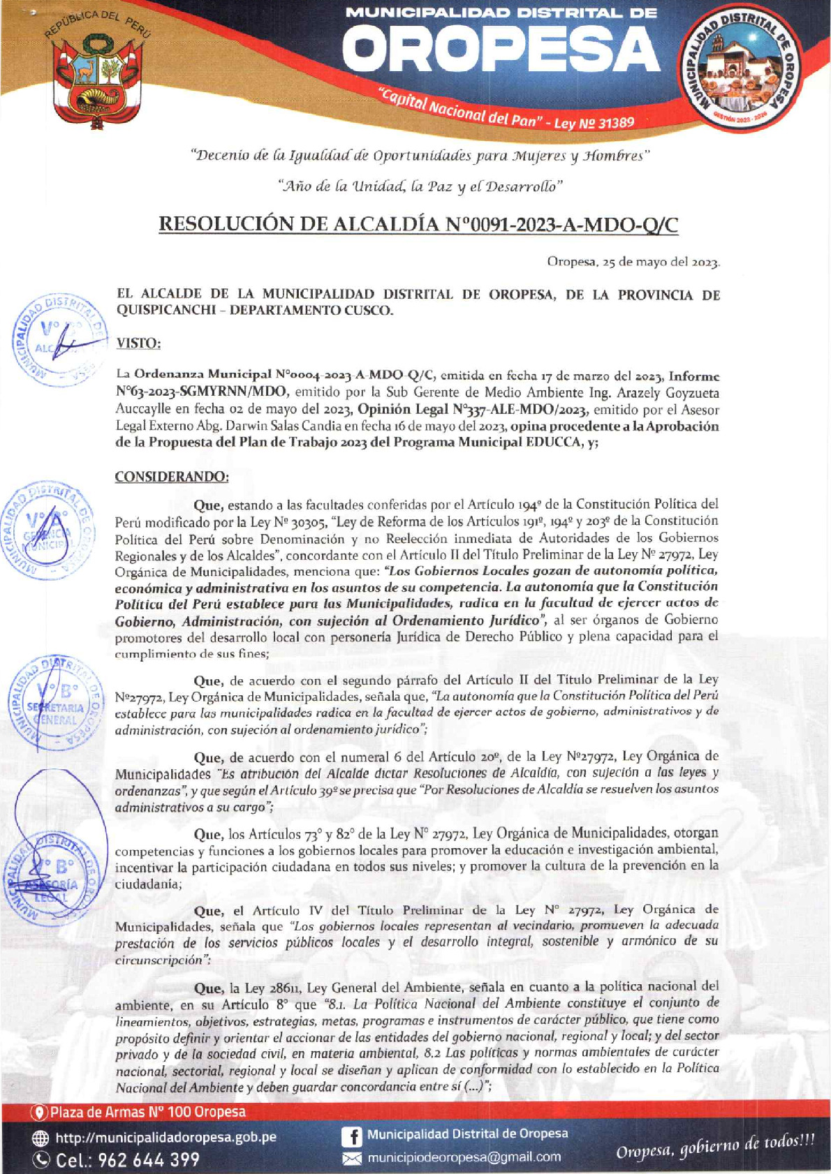 La presente Resolución de Alcaldía aprueba el Plan de Trabajo 2023 del Programa Municipal de Educación, Cultura y Ciudadanía Ambiental de la Municipalidad Distrital de Oropesa -Quispicanchi (Cusco), con la finalidad de definir las actividades de educación, cultura y ciudadanía ambiental que se desarrollaran en la localidad durante el presente año.