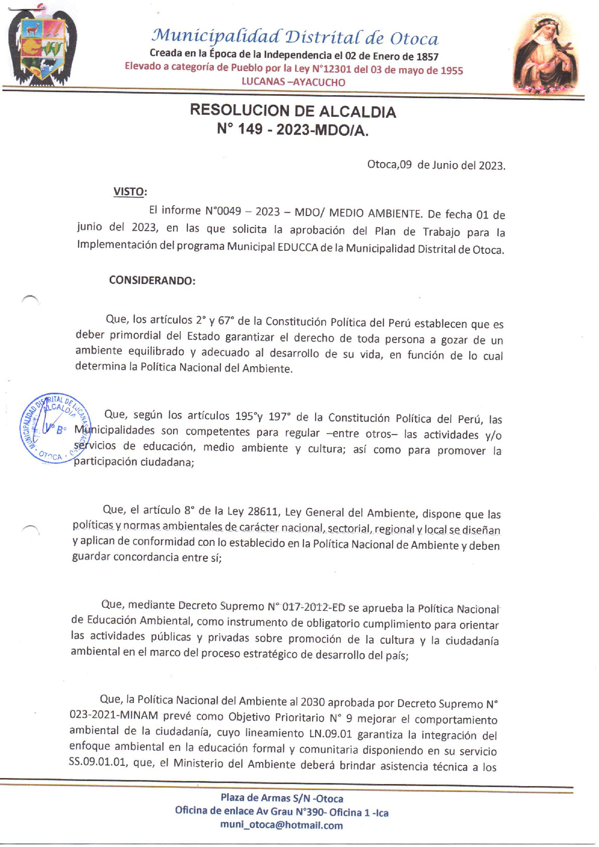 La presente Resolución de Alcaldía aprueba el Plan de Trabajo 2023 del Programa Municipal de Educación, Cultura y Ciudadanía Ambiental de la Municipalidad Distrital de Otoca -Lucanas (Ayacucho), con la finalidad de definir las actividades de educación, cultura y ciudadanía ambiental que se desarrollaran en la localidad durante el presente año.