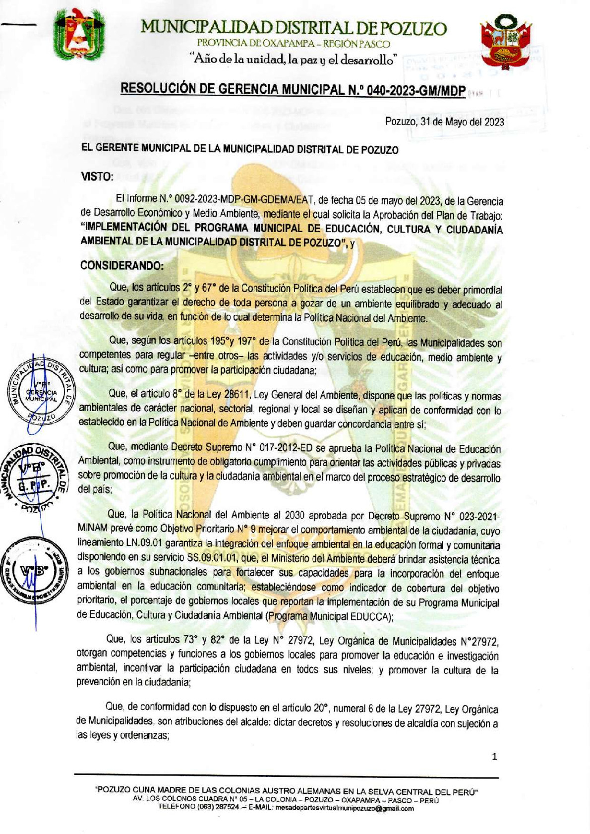 La presente Resolución de Gerencia Municipal aprueba el Plan de Trabajo 2023 del Programa Municipal de Educación, Cultura y Ciudadanía Ambiental de la Municipalidad Distrital de Pozuzo (Pasco), con la finalidad de definir las actividades de educación, cultura y ciudadanía ambiental que se desarrollaran en la localidad durante el presente año.