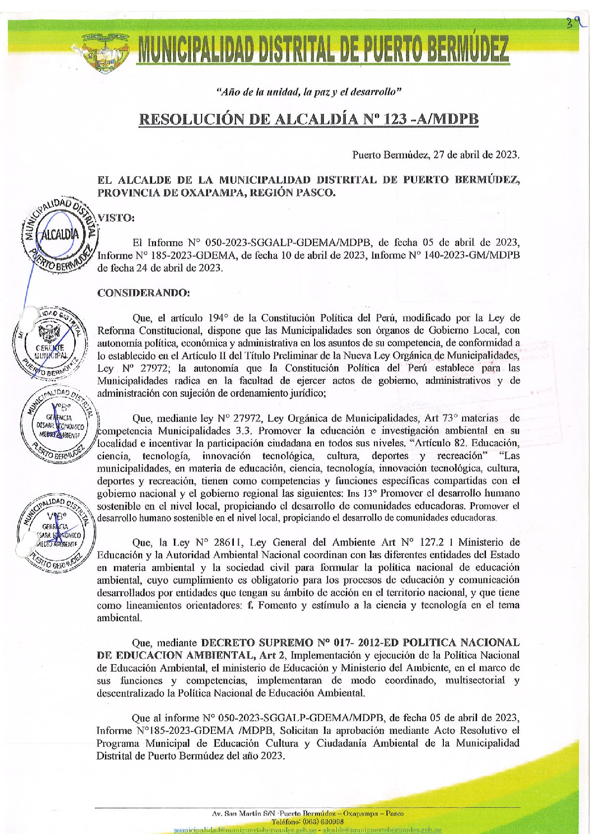 La presente Resolución de Alcaldía aprueba el Plan de Trabajo 2023 del Programa Municipal de Educación, Cultura y Ciudadanía Ambiental de la Municipalidad Distrital de Puerto Bermúdez (Pasco), con la finalidad de definir las actividades de educación, cultura y ciudadanía ambiental que se desarrollaran en la localidad durante el presente año.