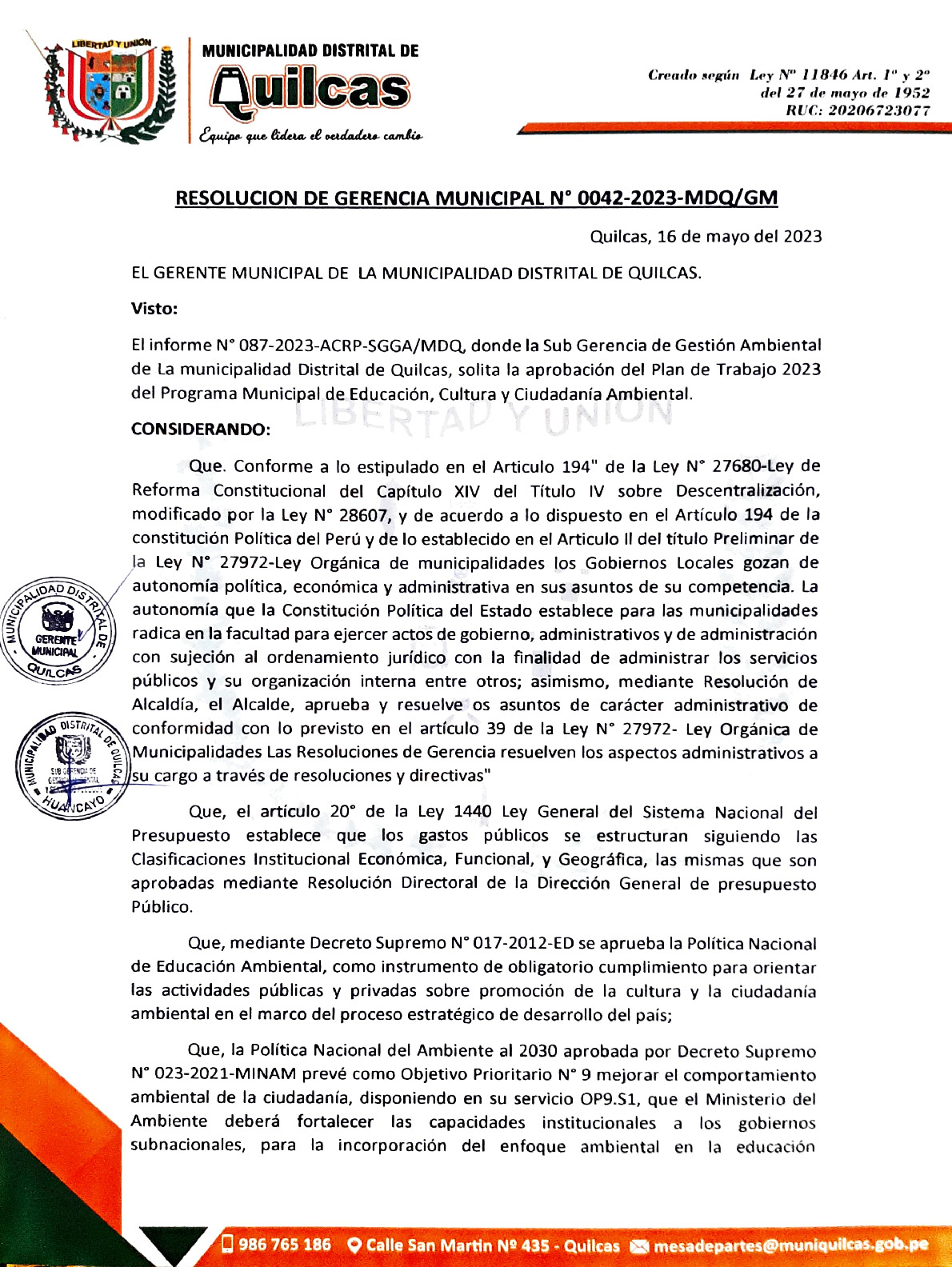 La presente Resolución de Gerencia Municipal aprueba el Plan de Trabajo 2023 del Programa Municipal de Educación, Cultura y Ciudadanía Ambiental de la Municipalidad Distrital de Quilcas (Junín), con la finalidad de definir las actividades de educación, cultura y ciudadanía ambiental que se desarrollaran en la localidad durante el presente año.