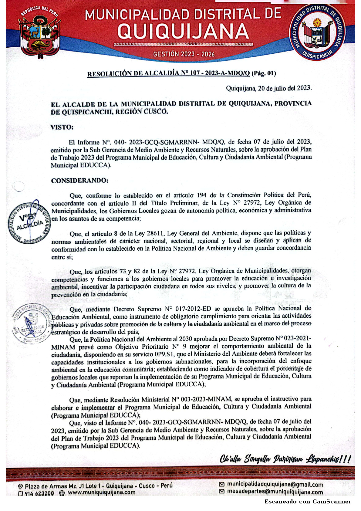 La presente Resolución de Alcaldía aprueba el Plan de Trabajo 2023 del Programa Municipal de Educación, Cultura y Ciudadanía Ambiental de la Municipalidad Distrital de Quiquijana -Quispicanchi (Cusco), con la finalidad de definir las actividades de educación, cultura y ciudadanía ambiental que se desarrollaran en la localidad durante el presente año.