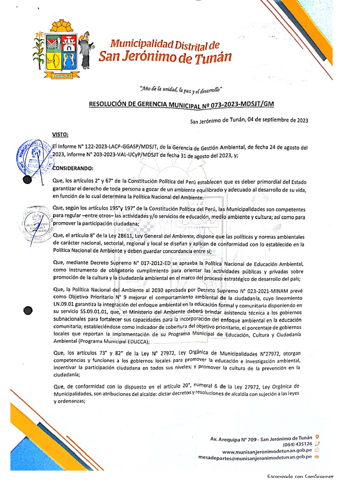 La presente Resolución de Gerencia Municipal aprueba el Plan de Trabajo 2023 del Programa Municipal de Educación, Cultura y Ciudadanía Ambiental de la Municipalidad Distrital de San Jerónimo de Tunán (Junín), con la finalidad de definir las actividades de educación, cultura y ciudadanía ambiental que se desarrollaran en la localidad durante el presente año.