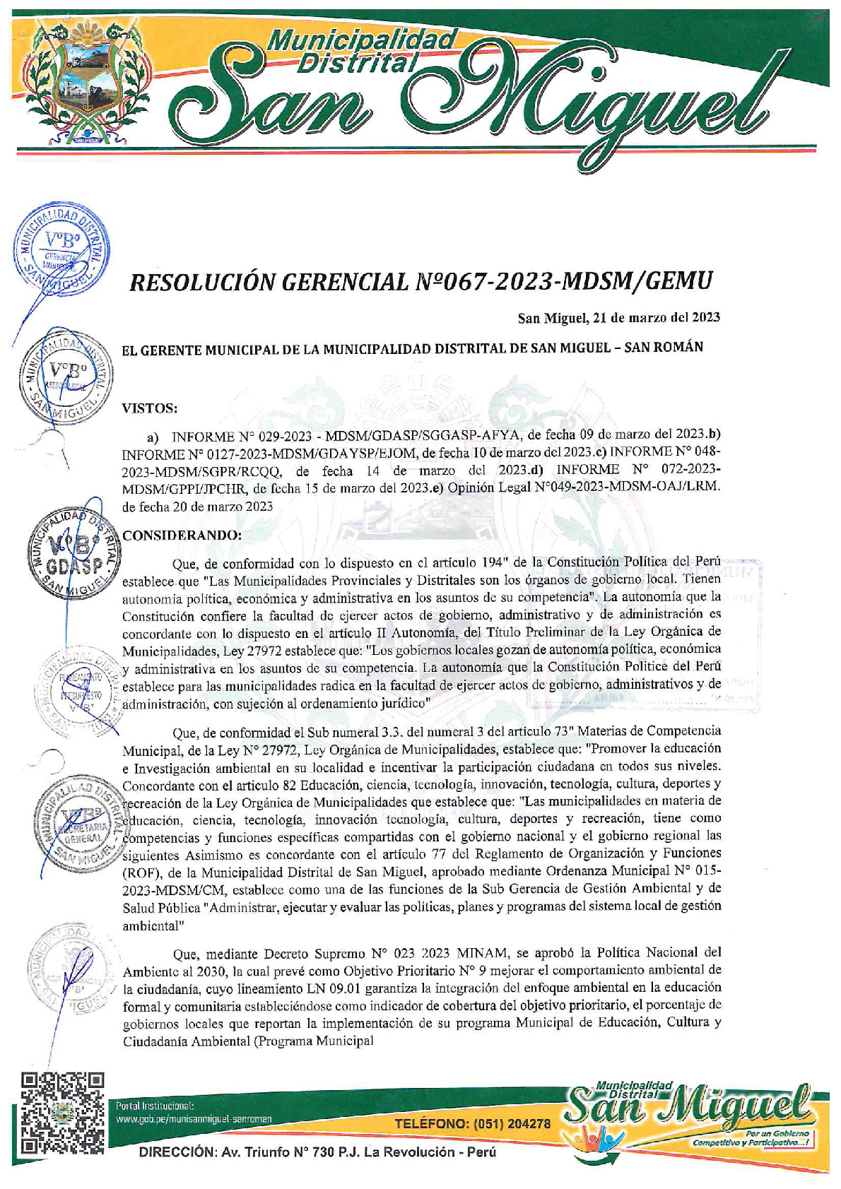 La presente Resolución de Gerencia Municipal aprueba el Plan de Trabajo 2023 del Programa Municipal de Educación, Cultura y Ciudadanía Ambiental de la Municipalidad Distrital de San Miguel (Puno), con la finalidad de definir las actividades de educación, cultura y ciudadanía ambiental que se desarrollaran en la localidad durante el presente año.