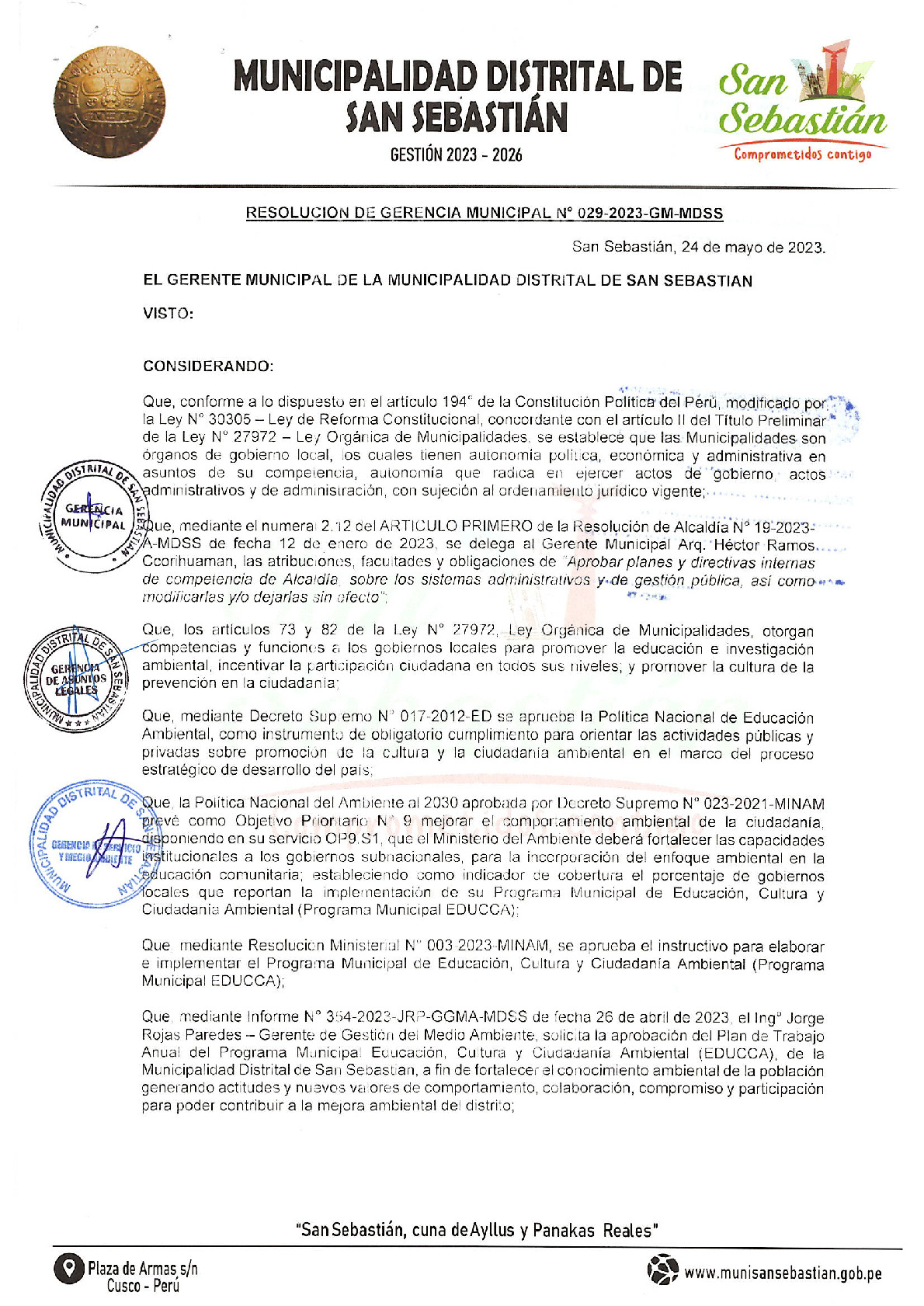 La presente Resolución de Gerencia Municipal aprueba el Plan de Trabajo 2023 del Programa Municipal de Educación, Cultura y Ciudadanía Ambiental de la Municipalidad Distrital de San Sebastían (Cusco), con la finalidad de definir las actividades de educación, cultura y ciudadanía ambiental que se desarrollaran en la localidad durante el presente año.