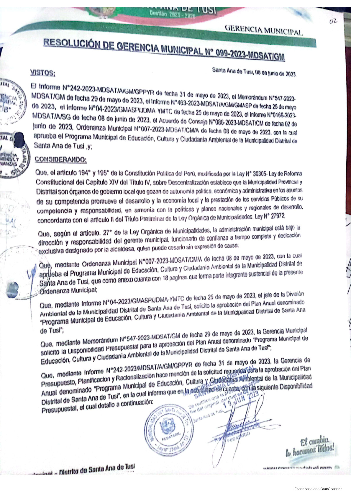 La presente Resolución de Gerencia Municipal aprueba el Plan de Trabajo 2023 del Programa Municipal de Educación, Cultura y Ciudadanía Ambiental de la Municipalidad Distrital de Santa Ana de Tusi (Pasco), con la finalidad de definir las actividades de educación, cultura y ciudadanía ambiental que se desarrollaran en la localidad durante el presente año.