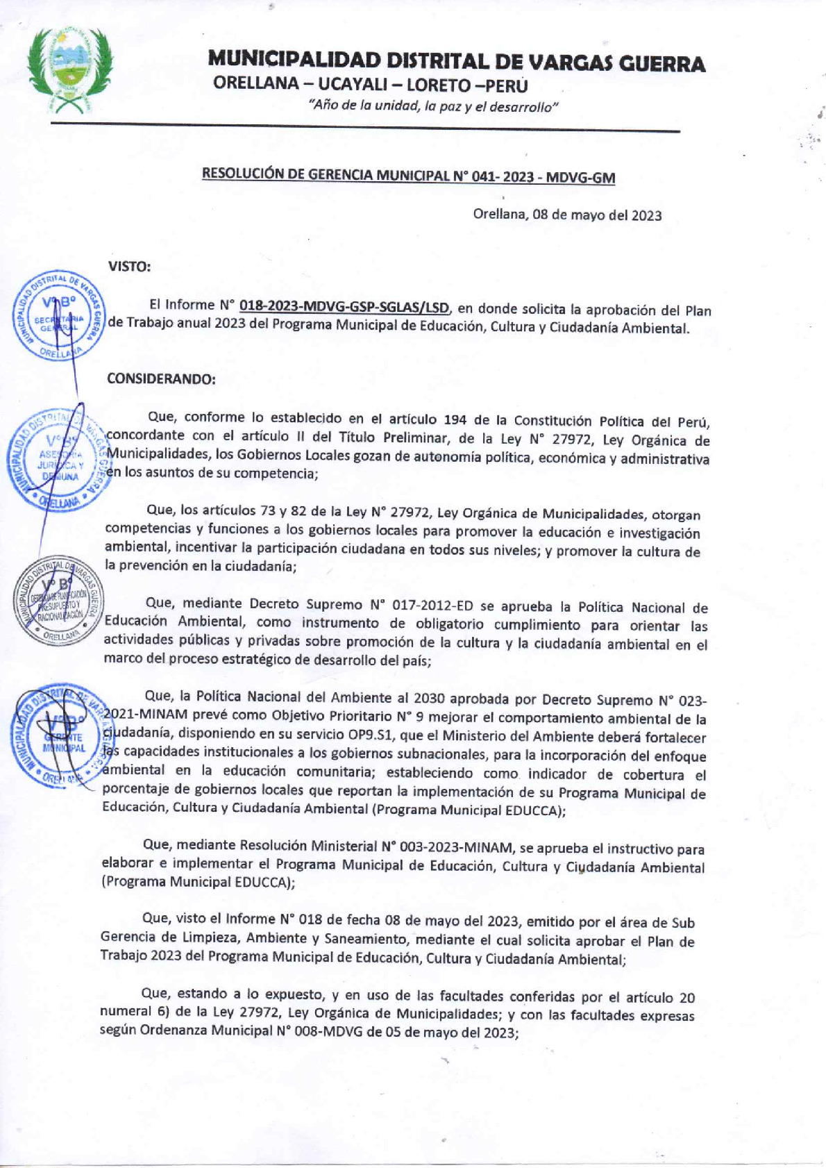 La presente Resolución de Gerencia Municipal aprueba el Plan de Trabajo 2023 del Programa Municipal de Educación, Cultura y Ciudadanía Ambiental de la Municipalidad Distrital de Vargas Guerra - Ucayali (Loreto), con la finalidad de definir las actividades de educación, cultura y ciudadanía ambiental que se desarrollaran en la localidad durante el presente año.