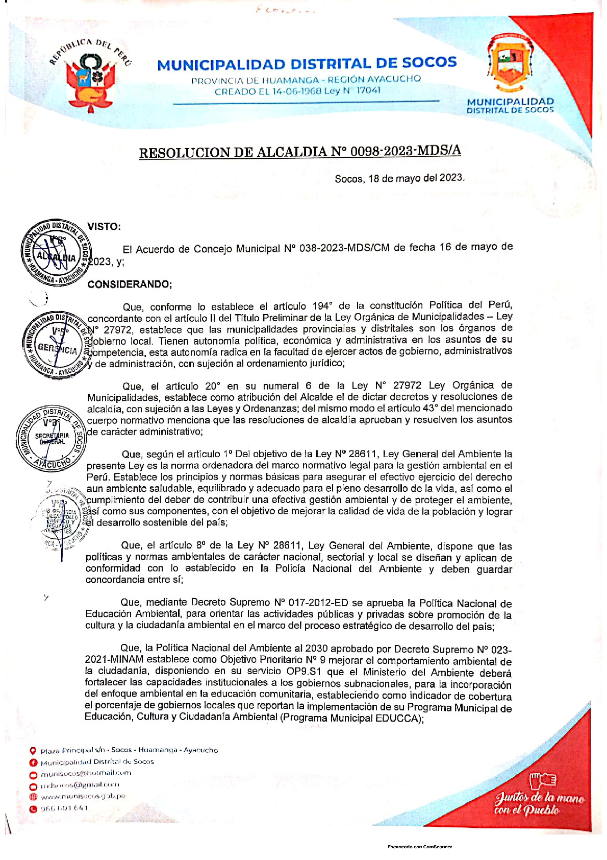 La presente Resolución de Alcaldía aprueba el Plan de Trabajo 2023 del Programa Municipal de Educación, Cultura y Ciudadanía Ambiental de la Municipalidad Distrital de Socos -Huamanga (Ayacucho), con la finalidad de definir las actividades de educación, cultura y ciudadanía ambiental que se desarrollaran en la localidad durante el presente año.