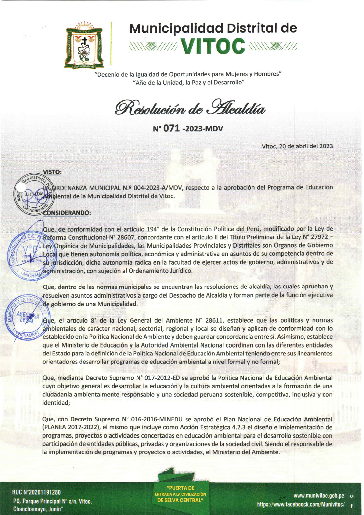 La presente Resolución de Alcaldía aprueba el Plan de Trabajo 2023 del Programa Municipal de Educación, Cultura y Ciudadanía Ambiental de la Municipalidad Distrital de Vitoc (Junín), con la finalidad de definir las actividades de educación, cultura y ciudadanía ambiental que se desarrollaran en la localidad durante el presente año.