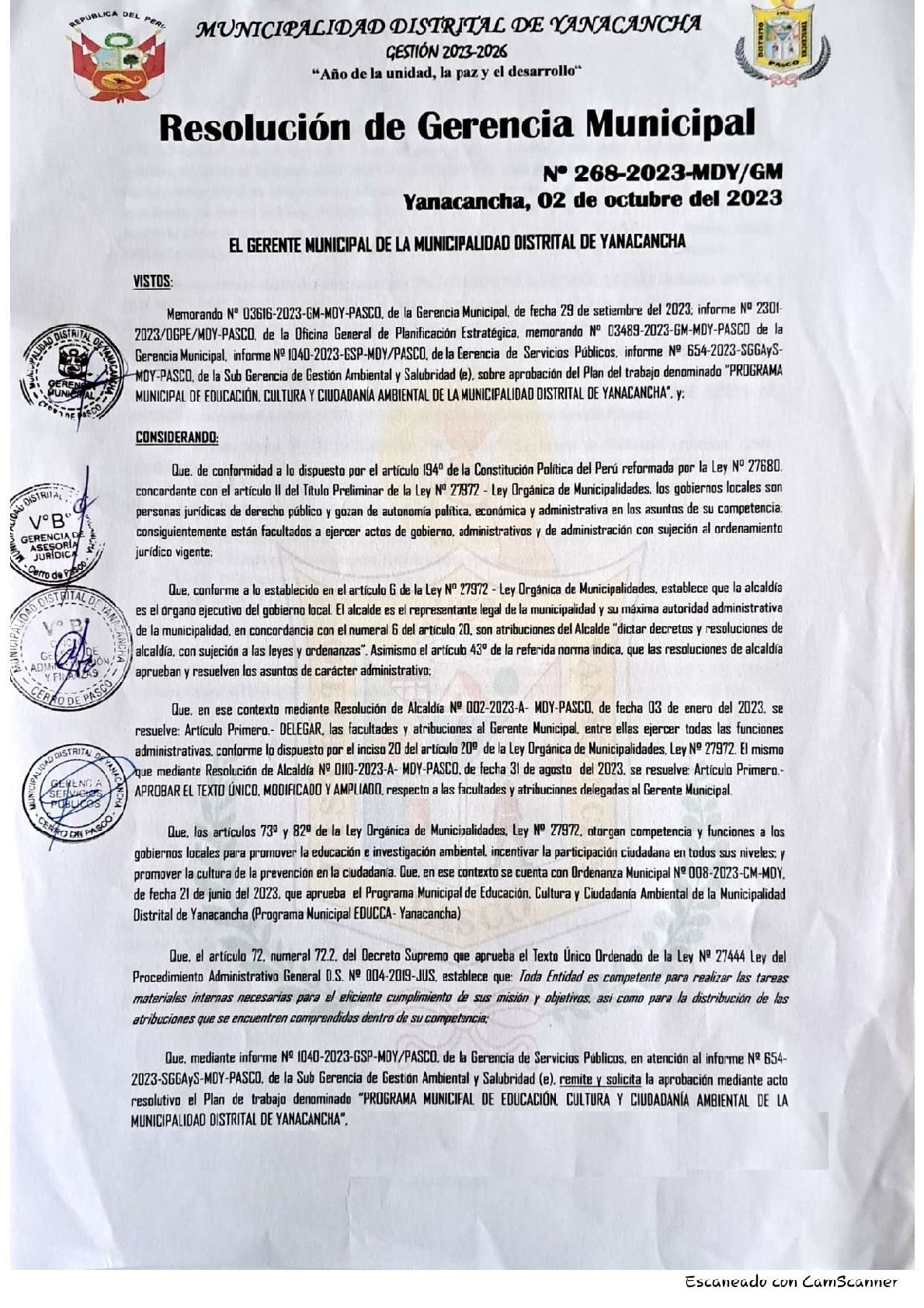 La presente Resolución de Gerencia Municipal aprueba el Plan de Trabajo 2023 del Programa Municipal de Educación, Cultura y Ciudadanía Ambiental de la Municipalidad Distrital de Yanacancha (Pasco), con la finalidad de definir las actividades de educación, cultura y ciudadanía ambiental que se desarrollaran en la localidad durante el presente año.