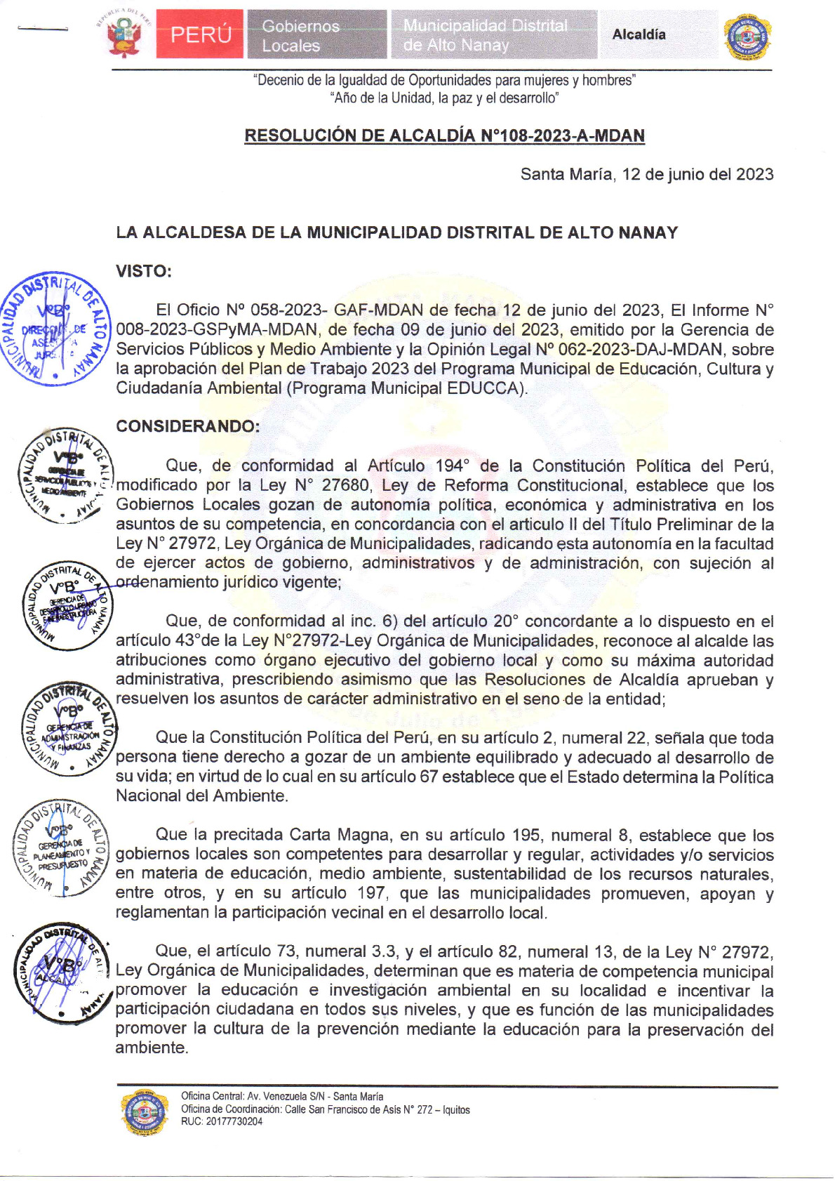 La presente Resolución de Alcaldía aprueba el Plan de Trabajo 2023 del Programa Municipal de Educación, Cultura y Ciudadanía Ambiental de la Municipalidad Distrital de Alto Nanay - Maynas (Loreto), con la finalidad de definir las actividades de educación, cultura y ciudadanía ambiental que se desarrollaran en la localidad durante el presente año.