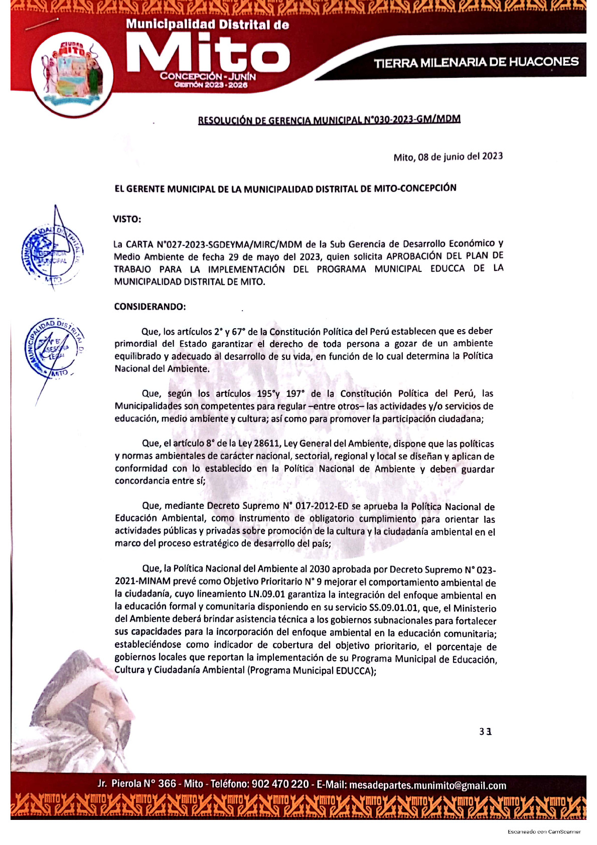 La presente Resolución de Gerencia Municipal aprueba el Plan de Trabajo 2023 del Programa Municipal de Educación, Cultura y Ciudadanía Ambiental de la Municipalidad Distrital de Mito (Junín), con la finalidad de definir las actividades de educación, cultura y ciudadanía ambiental que se desarrollaran en la localidad durante el presente año.