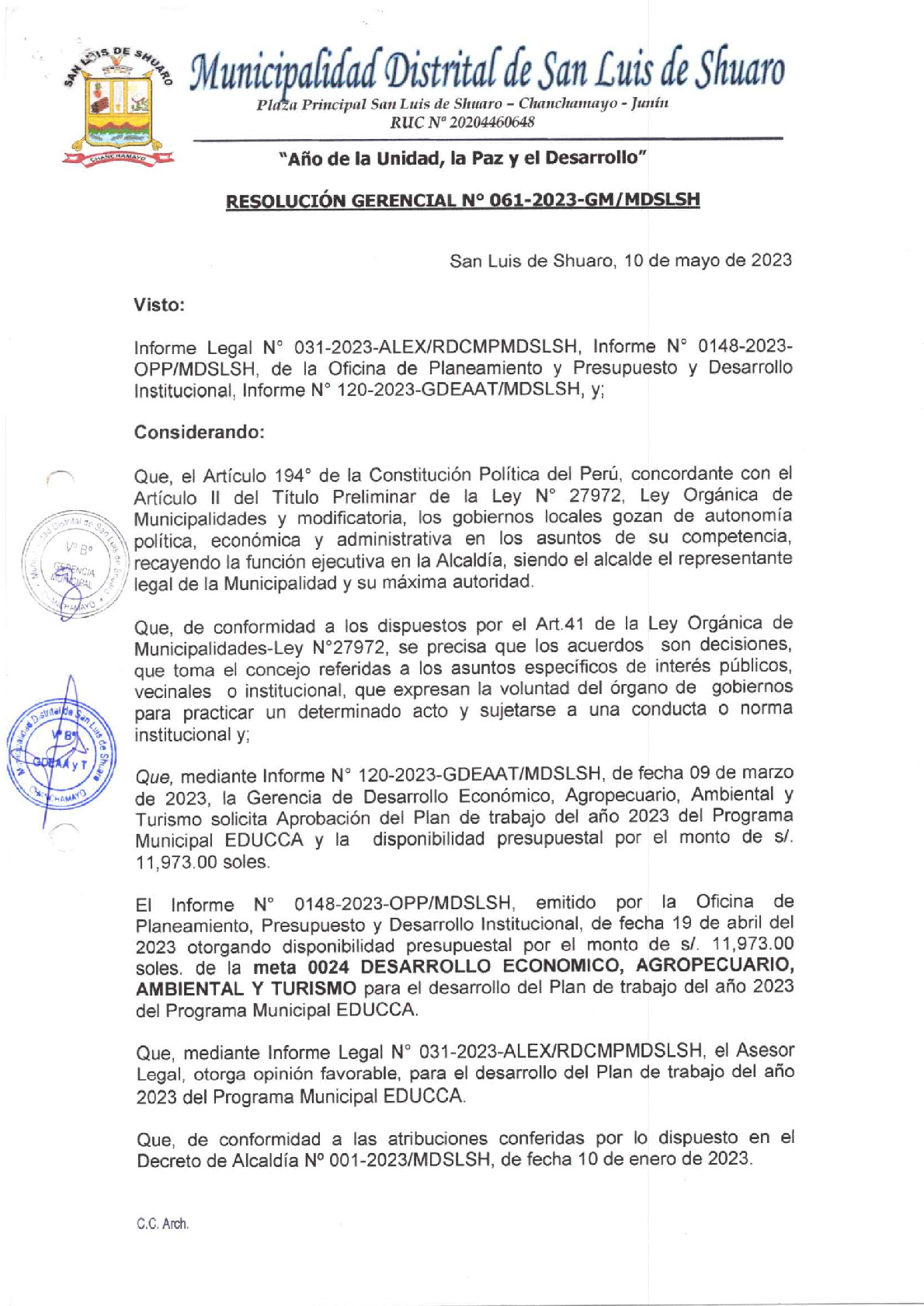 La presente Resolución de Gerencia Municipal aprueba el Plan de Trabajo 2023 del Programa Municipal de Educación, Cultura y Ciudadanía Ambiental de la Municipalidad Distrital de San Luis de Shuaro (Junín), con la finalidad de definir las actividades de educación, cultura y ciudadanía ambiental que se desarrollaran en la localidad durante el presente año.