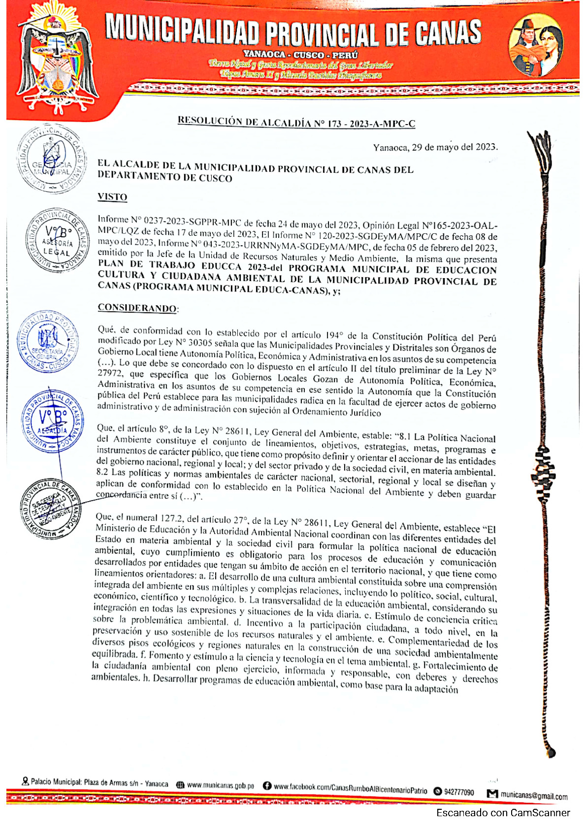 La presente Resolución de Alcaldía aprueba el Plan de Trabajo 2023 del Programa Municipal de Educación, Cultura y Ciudadanía Ambiental de la Municipalidad Provincial de Canas (Cusco), con la finalidad de definir las actividades de educación, cultura y ciudadanía ambiental que se desarrollaran en la localidad durante el presente año.