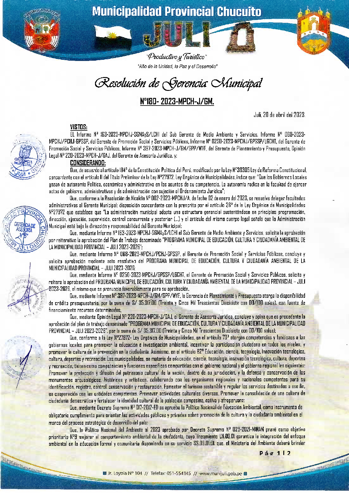 La presente Resolución de Gerencia Municipal aprueba el Plan de Trabajo 2023 del Programa Municipal de Educación, Cultura y Ciudadanía Ambiental de la Municipalidad Provincial de Chucuito (Puno), con la finalidad de definir las actividades de educación, cultura y ciudadanía ambiental que se desarrollaran en la localidad durante el presente año.