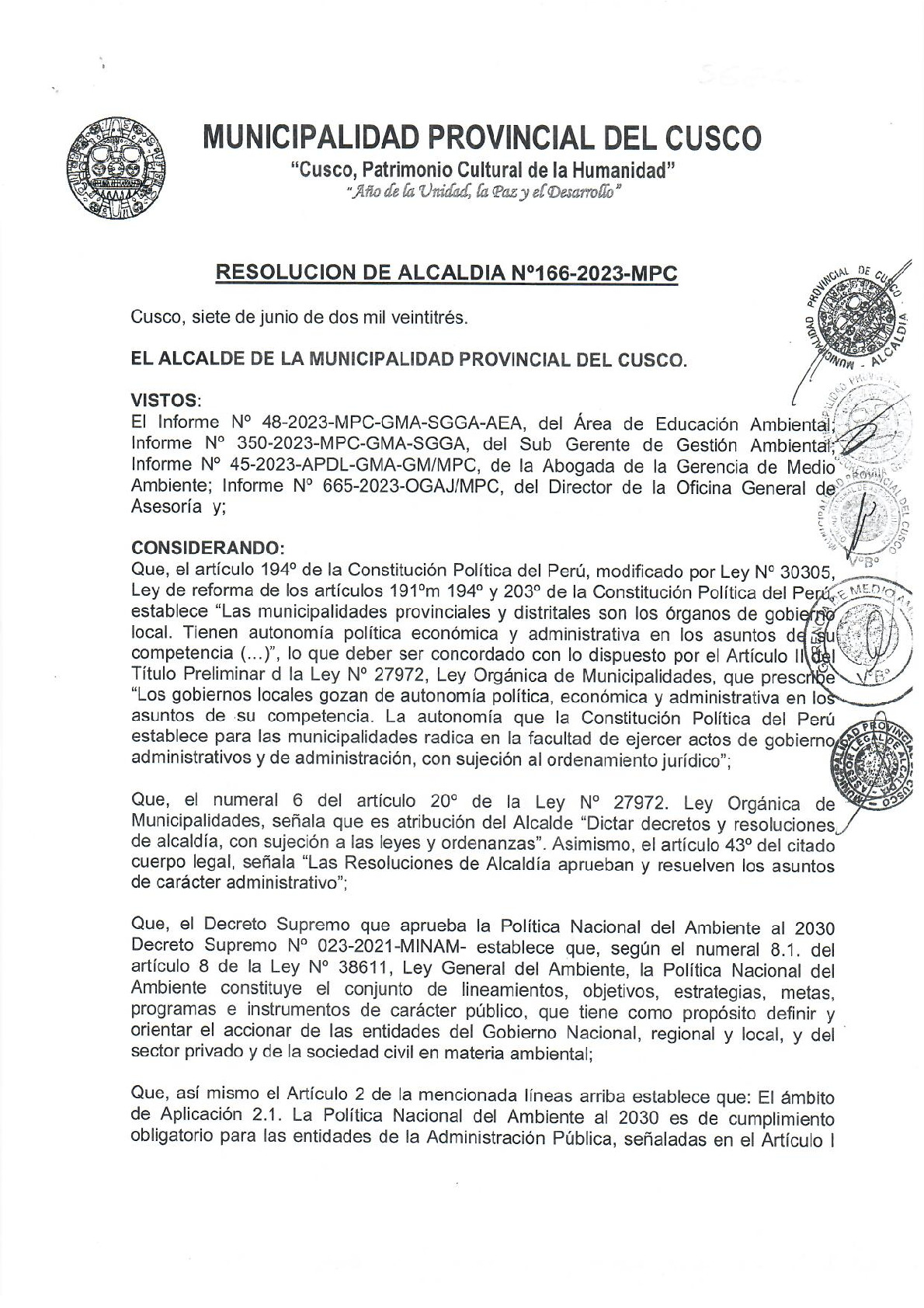 La presente Resolución de Alcaldía aprueba el Plan de Trabajo 2023 del Programa Municipal de Educación, Cultura y Ciudadanía Ambiental de la Municipalidad Provincial de Cusco (Cusco), con la finalidad de definir las actividades de educación, cultura y ciudadanía ambiental que se desarrollaran en la localidad durante el presente año.