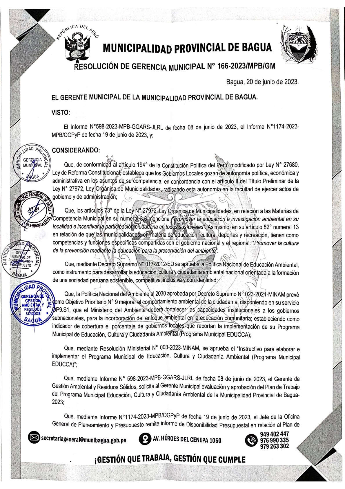 La presente Resolución de Gerencia Municipal aprueba el Plan de Trabajo 2023 del Programa Municipal de Educación, Cultura y Ciudadanía Ambiental de la Municipalidad Provincial de Bagua (Amazonas), con la finalidad de definir las actividades de educación, cultura y ciudadanía ambiental que se desarrollaran en la localidad durante el presente año.